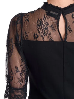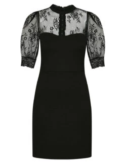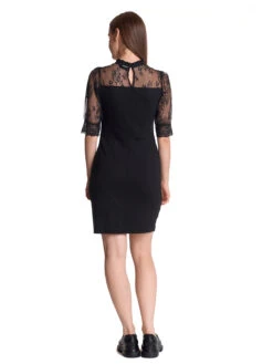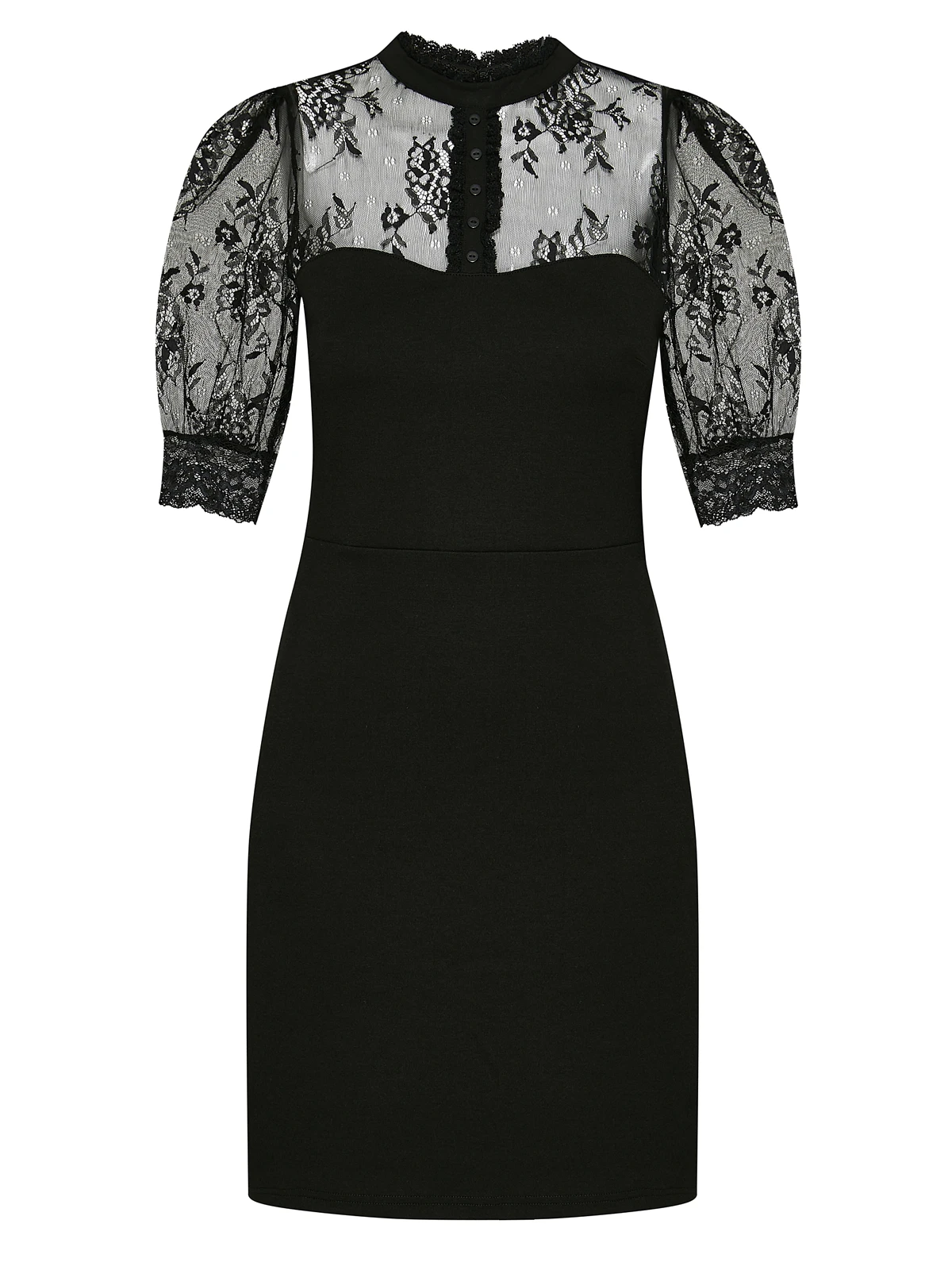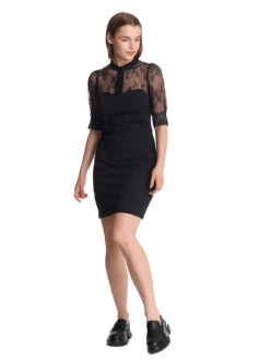 Gothic Love mit Vive Maria Das traumhaft schöne Vive Maria Kleid ist aus einem angenehmen Viskose-Polyester-Gemisch mit Elasthananteil. Die eingesetzte Spitze ist aus einem weichen Polyamid, bzw. Polyester-Elsthan-Material. Der Futterstoff im Rockteil ist aus Polyester. Das Kleid ist aus einem dicken Jersey und ist unifarben schwarz. Das Vive Maria Kleid ist figurbetont geschnitten und verläuft in einer sanften A-Linie. Es hat kurze Arme und einen kleinen Stehkragen, der im Nacken mit einem kleinen Knopf geschlossen wird. Eine Fake-Knopfeiste, die bis zur Brust reicht, ziert den vorderen Bereich. Die Arme, sowie der Schulterbereich sind aus transparenter schwarzer Spitze. Seitliche Abnäher im Brustbereich, sowie eine Teilungsnaht im Teillenbereich sorgen für einen guten Sitz. Für das vereinfachte an- und ausziehen sorgt ein seitlich eingearbeiteter Reißverschluss. Das Gothic Love Kleid kann super mit Boots kombiniert werden und passt somit perfekt in den Alltag. Mit Pumps oder Stiefeln bist du im Handumdrehen schick zum Ausgehen. Vordere Länge in Gr. S ca. 89 cm.
