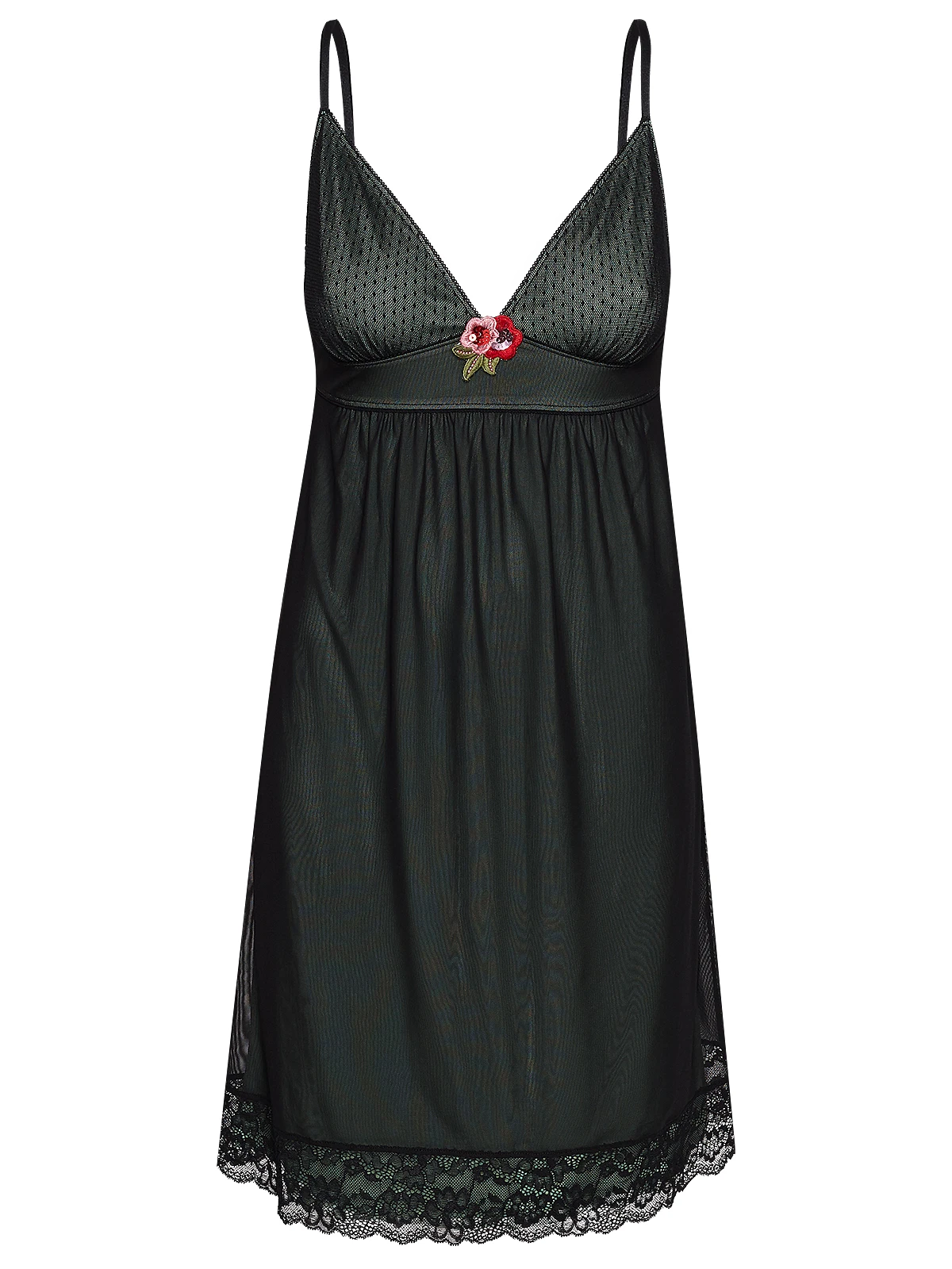Das süße Vive Maria Kleid ist aus einem leichten Viskosematerial. Der darüberliegende Tüll ist aus einem Polyester-Elasthan-Gemisch. Das Kleid hat eine gerade Passform und fällt angenehm um die Beine. Die dünnen Träger sind hinten verstellbar und werden vorne mit einem kleinen Ring am Kleid befestigt. Der Brustbereich ist mit schwarzem Pünktchentüll überzofen und mit einer schwarzen Zick-Zack-Litze verziert. Ein Strickpatch in Rosenform bildet das Highlight des Ausschnitts. Eine breite Unterbrustnaht sorgt für einen guten Sitz. Über das restliche Kleid verläuft ein feiner schwarzer Tüll, dieser ist etwas länger als das grüne Unterkleid und wird mit einer breiten Spitzenbordüre abgeschlossen. Das ‚Green Summer Dress‘ ist das perfekte Kleid für die nächste Gartenparty. Zarter Tüll und Spitze garantieren dir einen fantastischen Auftritt. Kombiniert werden kann das Kleid mit High Heels und einem schwarzen Jäckchen.