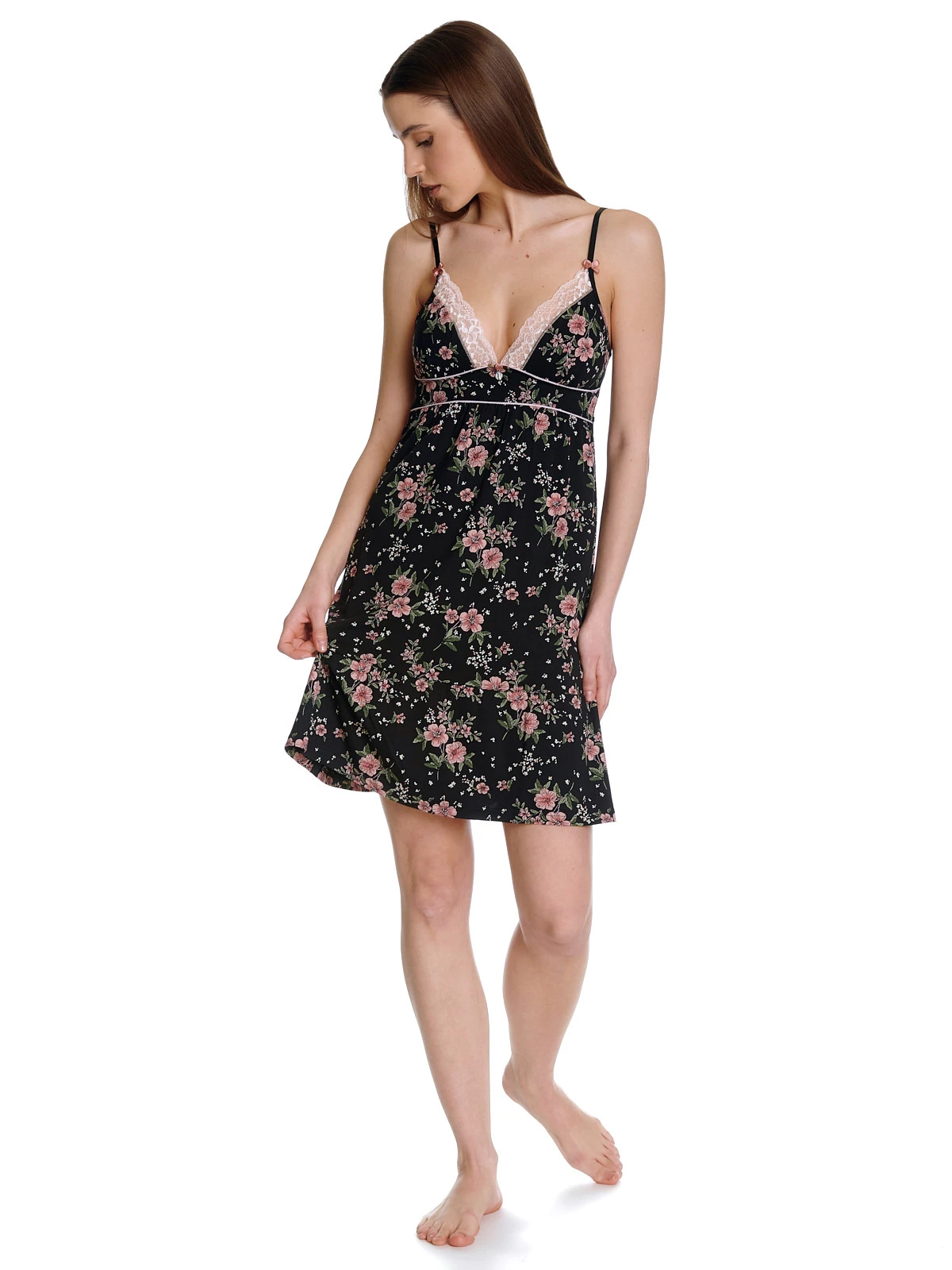 Vive Maria Negligee aus einem angenehmen Viskosematerial mit Elasthananteil, Spitzeneinsatz aus einem Polyamid-Elasthan-Gemisch, rosafarbene HibiskusblĂĽten auf schwarzem Stoff – gerade aber figurnahe Passform – dĂĽnne verstellbare Träger mit Satinschleife – Spitzenverzierung am V-Ausschnitt – Metallanhänger und Satinrose im Dekolletee – rosafarbene Häkellitze als Unterbrustnaht Länge in Gr. S ohne Träger ca. 75 cm