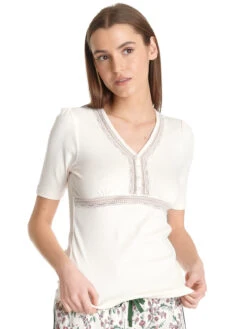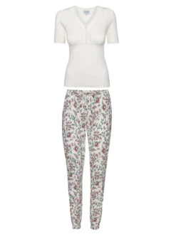 – sommerlicher Vive Maria Pyjama bestehend aus Ober- und Unterteil – cremefarbenes, figurbetontes Oberteil mit kurzen Armen – V-Ausschnitt mit Spitzenbordüre, Knopfleiste und Unterbrustnaht – Rippstoff aus Baumwolle mit Elasthananteil – Länge in Gr. S ca. 58 cm – schmal geschnittene Hose mit langen Hosenbeinen und Bündchen als Abschluss – breiter Gummibund mit zusätzlichem Bindeband – Stretchpaspel entlang des Hosenbeins – floraler Blumenprint auf cremefarbenem Stoff aus Baumwoll-Modal-Gemisch – Innenbeinlänge in Gr. S ca. 76 cm