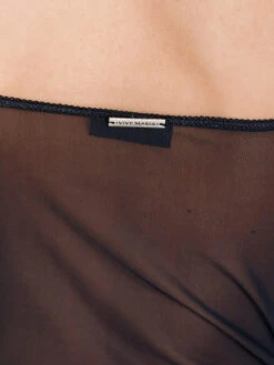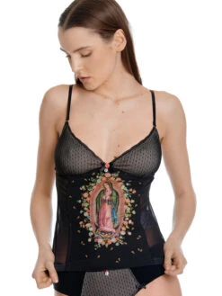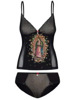 Das Vive Maria Wäscheset ist aus einem angenehmen Materialmix. Der transparente Tüll ist aus einem Polyestermaterial mit Elasthananteil, der Einsatz vorne sowie das Futter ist aus leichter Viskose mit Elasthan, der Pünktchentüll. Die Panty ist aus einem Viskosematerial mit Elasthan, der eingestzte Tüll ist ebenfalls aus einem Polyester-Elasthan-Gemisch. – figurbetontes Hemdchen mit dünnen verstellbaren Trägern – Ausschnitt mit Spitze, Metallanhänger und Rosenapplikation – gefütterte Cups mit Pünktchentüll – großer Aufdruck von Heiligenbild vorne – transparenter Tüll im Rückenbereich und seitlich Länge in Gr. S ohne Träger ca. 41 cm – schwarzer Slip mit Satingummibund, Metallanhänger und Rosenapplikation – Einsatz vorne mit gefüttertem Pünktchentüll – Zick-Zack-Litze als Beinabschluss mit Satinschleifen verzierhung. Vordere Länge bis Zwickelnaht in Gr. S ca. 23 cm