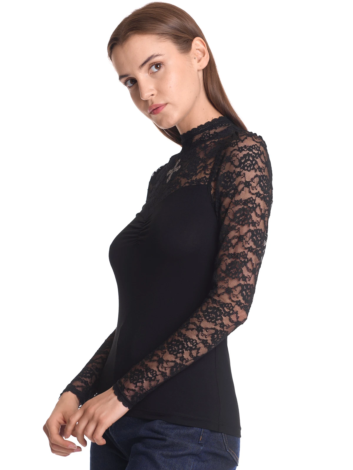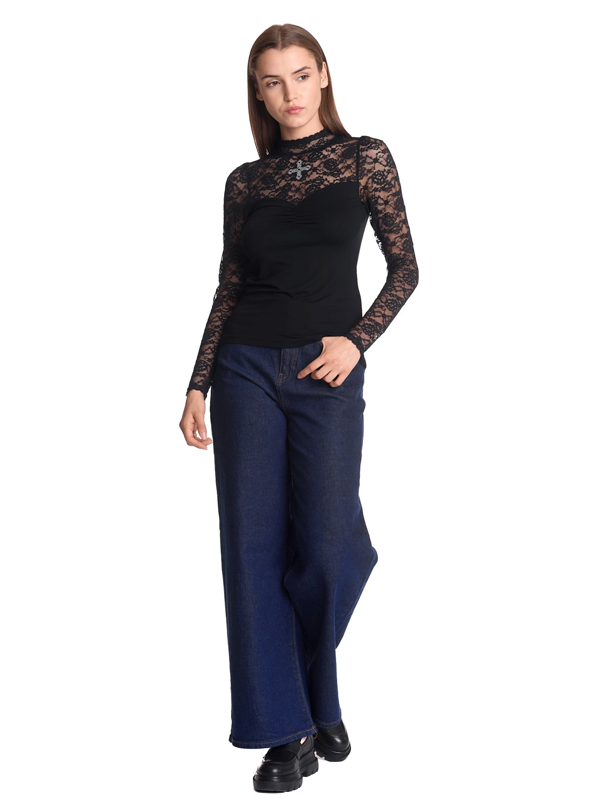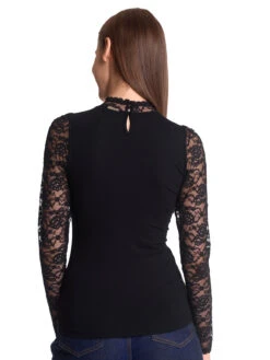 Lace Vamp mit Vive Maria Das traumhaft schöne Vive Maria Shirt ist aus einem angenehmen Viskosematerial mit Elasthananteil. Die eingestzte Spitze ist aus einem Polyester-Elasthan-Gemisch. Das Shirt ist unifarben schwarz. Das Vive Maria Shirt ist figurbetont geschnitten und hat lange Arme, die mit einer breiten SpitzenbordĂĽre abgeschlossen werden. Die Arme, sowie der obere Bereich sind ebenfalls aus schwarzer transparenter Spitze. Ein aufgesetzter Kreuzpatch ziert den vorderen Bereich. Das Shirt hat einen kleinen Stehkragen. Kleine Raffungen im Brustbereich zaubern ein schönes Dekolletee. Das ‚Lace Vamp‘ Shirt ist rockig und edel zugleich. Es passt zur engen Hose, zur Bikerjacke oder auch zum Blazer. Länge in Gr. S ca. 58 cm.