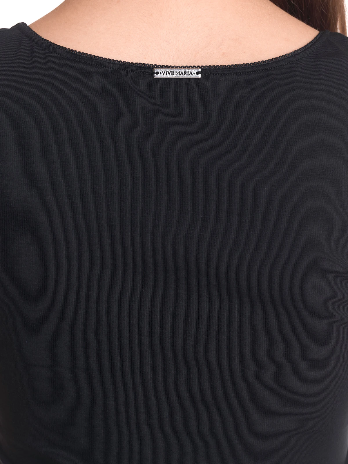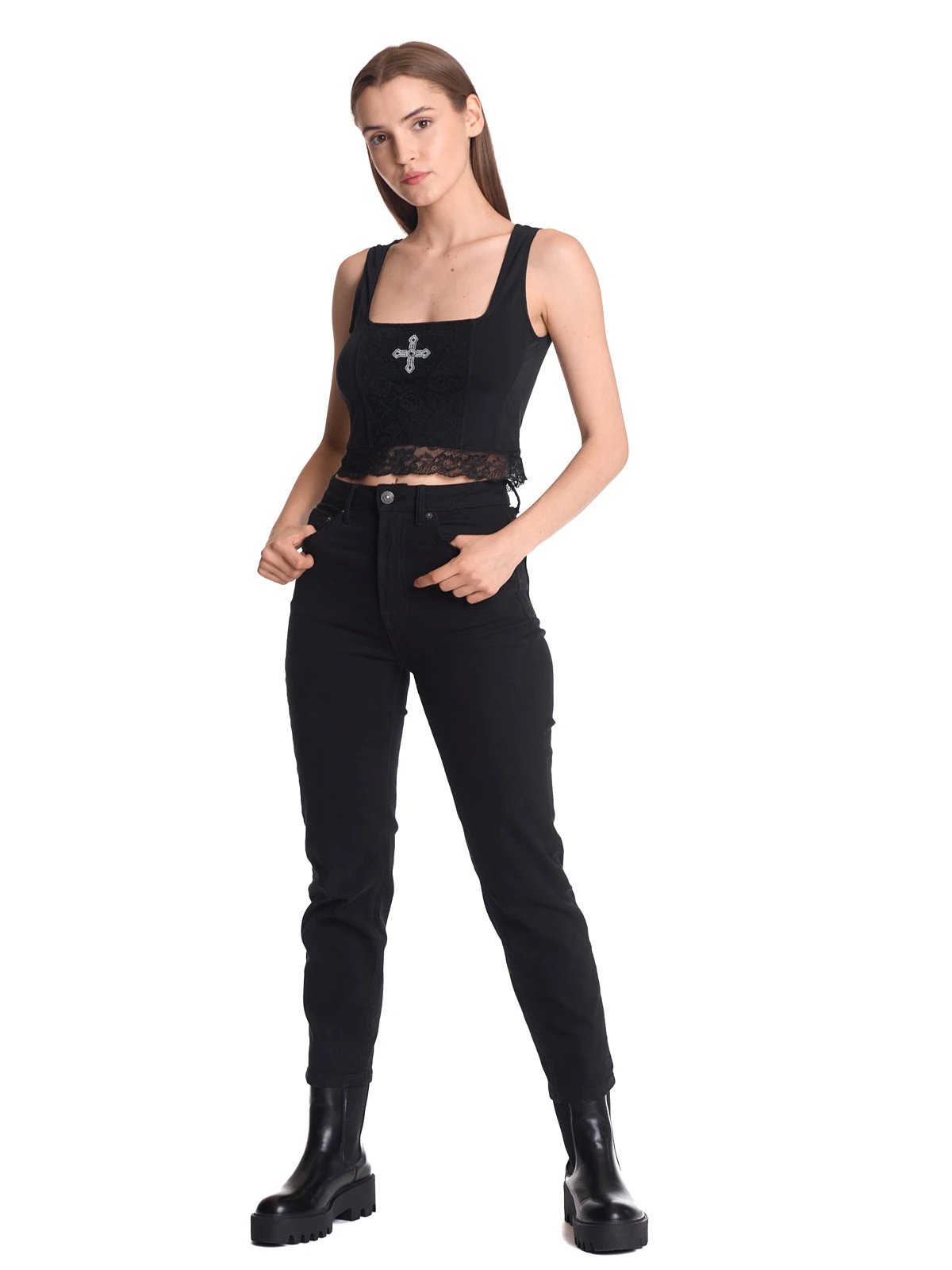 Lace Vamp mit Vive Maria Das coole Vive Maria Top ist aus einem angenehmen Baumwollmaterial mit Elasthananteil. Die eingesetzte Spitze im vorderen Bereich sowie der Spitzenabschluss ist aus einem Polyester-Elasthan-Gemisch. Das Trägertop ist kurz und figurbetont geschnitten. Die breiten Träger sowie der Ausschnitt sind mit einer schwarzen Litze verziert. Ziernähte im vorderen Bereich verleihen dem Top einen rockigen Look. Der Mittelteil ist mit schwarzer Spitze überzogen. Ein Patch in Kreuzform ist im Brustbereich angebracht. Das Top wird mit einer Bordüre aus transparenter Spitze abgeschlossen. Das Lace Vamp Bustier passt hervorragend zur schwarzen Skinny Jeans und Boots. Länge in Gr. S ca. 43 cm