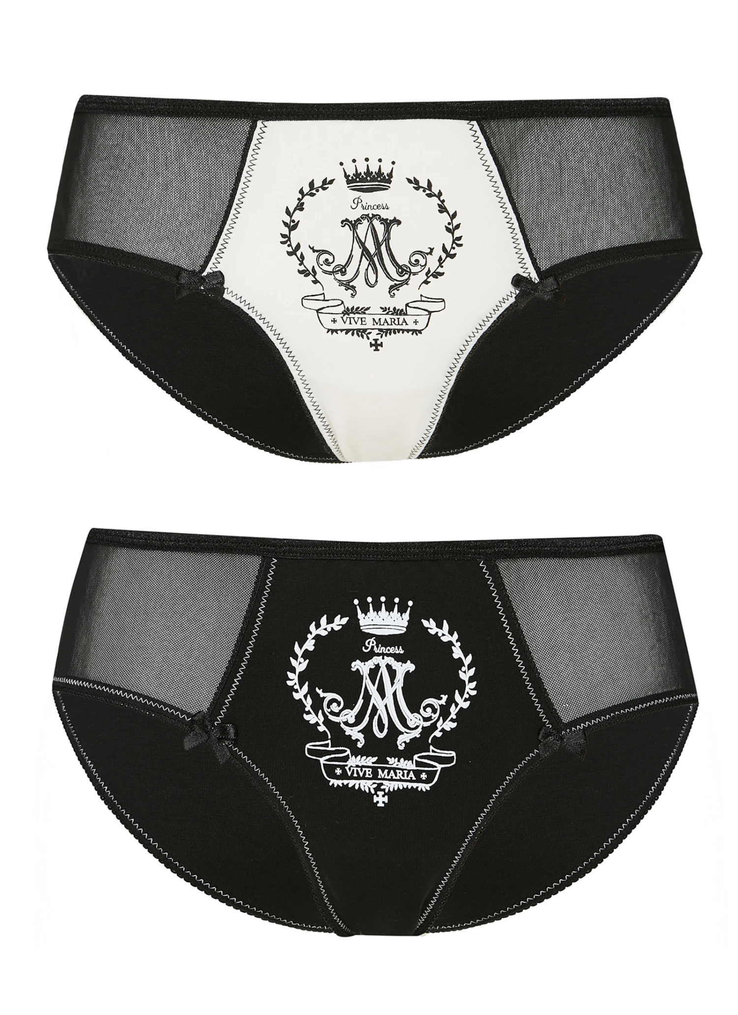 Like a Princess mit Vive Maria Das Pantyset besteht auszwei baugleichen Pantys, die sich nur in der Farbe unterscheiden. Die Pantys sind aus einem angenehmen Baumwoll-Elasthan-Gemisch, der seitliche Einsatz aus Feintüll ist aus Polyester mit etwas Elasthan. Ein Panty ist cremefarben, das andere schwarz. Der Bund der Panty ist aus einem schwarzen Satingummibund. Die Beinausschnitte sind mit schwarzen Zick-Zack-Litze abgeschlossen und mit einer kleinen Satinschleife verziert. Vorne mittig ist ein Vive Maria Logo platziert. Die seitlichen Eingriffe sind aus transparentem Feintüll. Vordere Länge bis Zwickelnaht ca. 23cm