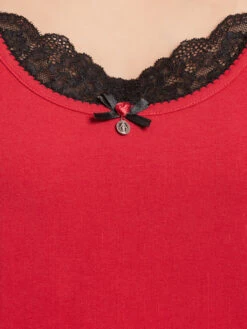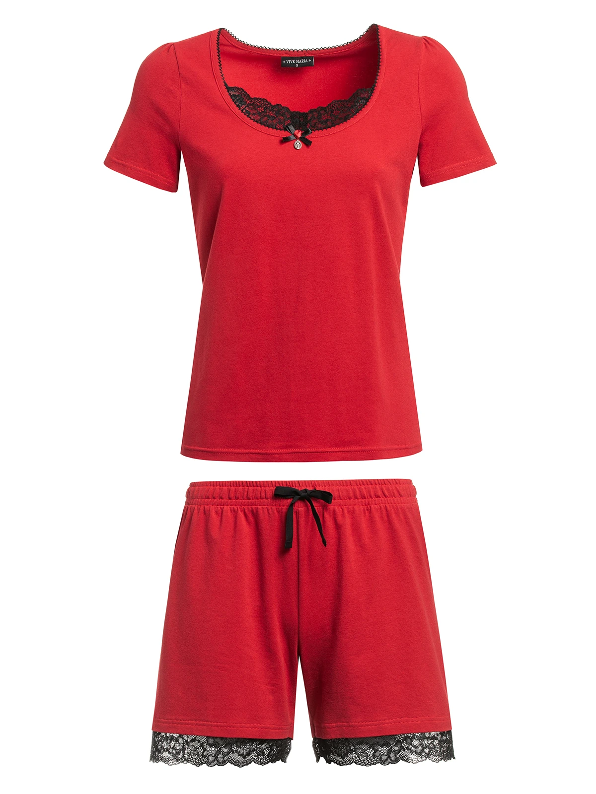 Der sĂĽĂźe Vive Maria Pyjama besteht aus zwei Teilen und ist aus einem angenehmen Baumwollmaterial mit Elasthananteil. Das Oberteil ist figurbetont geschnitten und hat kurze Arme. Der runde Ausschnitt ist mit einer schwarzen Litze eingefasst und mit einem Einsatz aus schwarzer transparenter Spitze verziert. Eine kleine Satinschliefe, Satinrose sowie ein Metallanhänger runden das Gesamtbild ab. Länge in Gr. S ca. 59 cm. Die kurze Hose hat einen breiten Gummibund und ein schmales Bindeband, dass der zusätzlichen Weitenregulierung dient. Die gerade geschnittenen Beine werden mit einer BordĂĽre aus schwarzer transparenter Spitze abgeschlossen. Innenbeinlänge in Gr. S ca. 13 cm. Der ‚Lipstick Girl Short Pyjama‘ ĂĽberzeugt mit einer tollen Farbe und angenehmen Material und ist defintiv der richtige Begleiter fĂĽr heiĂźe Nächte.