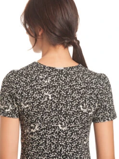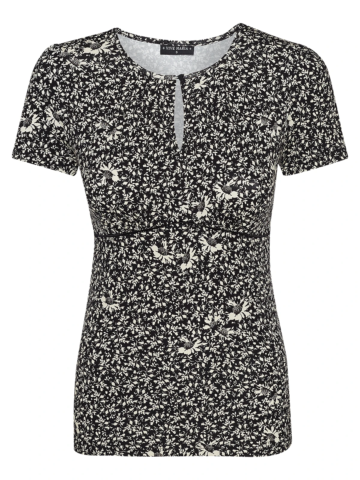 Ma Marguerite – das süße Vive Maria Shirt ist aus einem angenehmen Viskosematerial mit Elasthananteil. Es hat kurze Arme, die mit einer kleinen Blende in Stofffarbe abgeschlossen werden. Der runde Halsausschnitt wird vorne mit einem Knopf und einer Gummischlaufe geschlossen, sodass ein kleines Guckloch im vorderen Bereich entsteht. Eine schwarze Satinpaspel dient als Unterbrustnaht und sorgt für einen guten Sitz. Das Shirt ist figurbetont geschnitten. Der Druck zeigt cremefarbene Ranken und Margeritenblüten auf schwarzem Hintergrund. Das ‚Ma Marguerite Shirt‘ überzeugt mit einem zeitlosen aber doch verspielten Look. Es passt hervorragend zur schwarzen Paperbagpants und Stiefeletten. Kombiniert werden kann der Look mit einem Blazer oder einem Longcardigan.