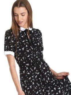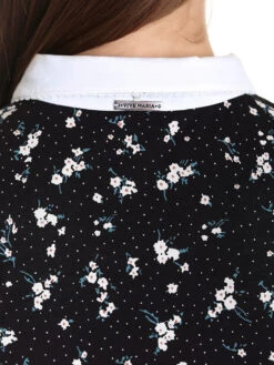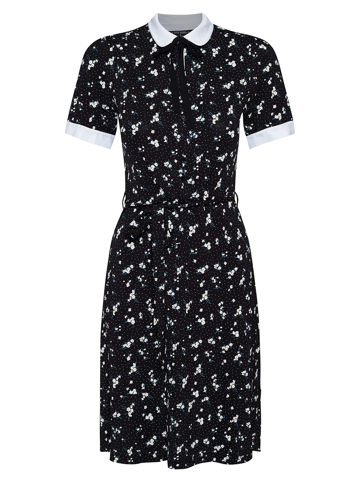Das sĂĽĂźe Sommerkleid von Vive Maria ist aus einem leichten Viskosematerial mit Elasthananteil. Der Kragen sowie die ArmabschlĂĽsse sind aus angenehmer Viskose. – leicht ausgestellte Passform mit angesetzem Volant als Saumabschluss – kurze Arme mit cremefarbener Blende als Abschluss – runter Halsausschnitt mit cremefarbenem Blusenkragen und Bindeband – durchgehende Knopfleiste, BindegĂĽrtel in Stofffarbe – heller Blumenprint auf schwarzem Stoff Länge in Gr. S ca. 94 cm