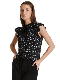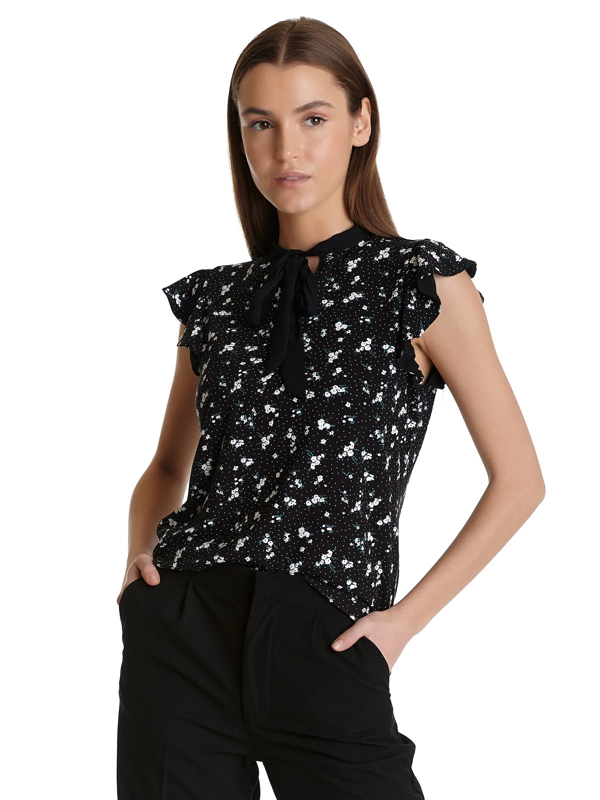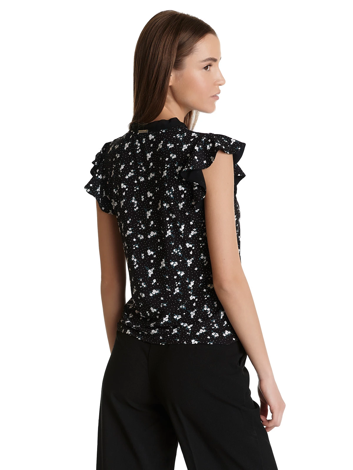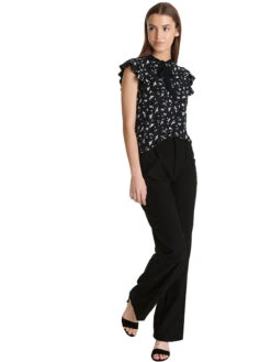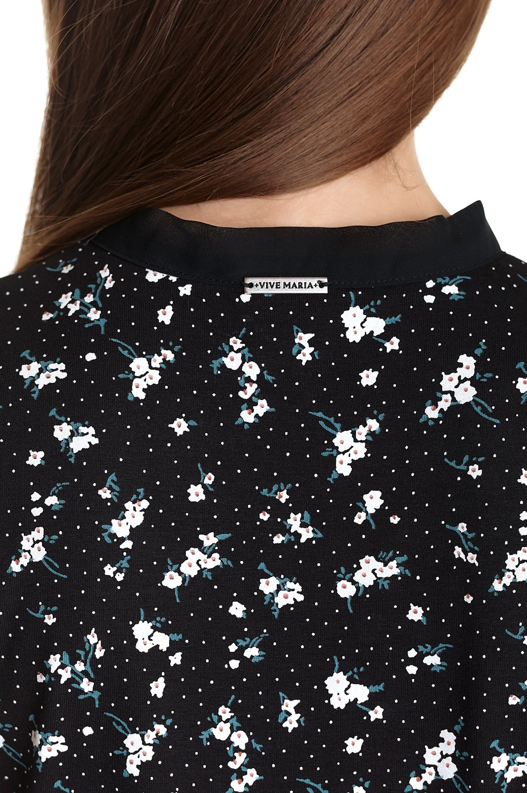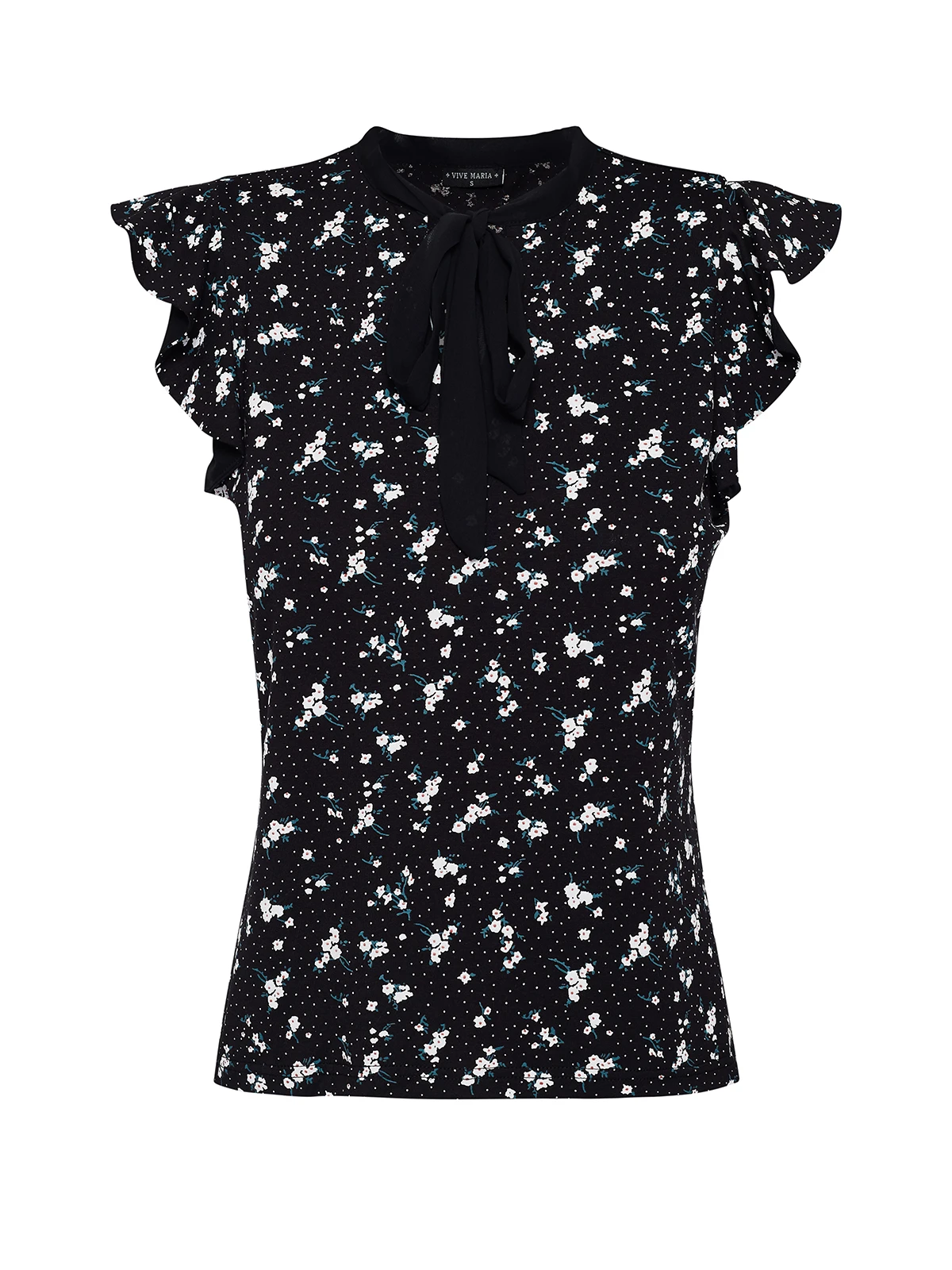 Die Vive Maria Bluse ist aus einem angenehmen Viskosematerial mit Elasthananteil. Kleine Blumenbouquets zieren schwarzen Stoff. – figurbetonte Passform – kurze Arme mit kleinem Volant – kleiner Stehkragen mit Bindeband, kleines Guckloch Länge in Gr. S ca. 58 cm