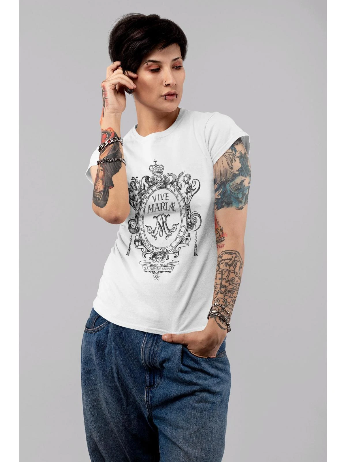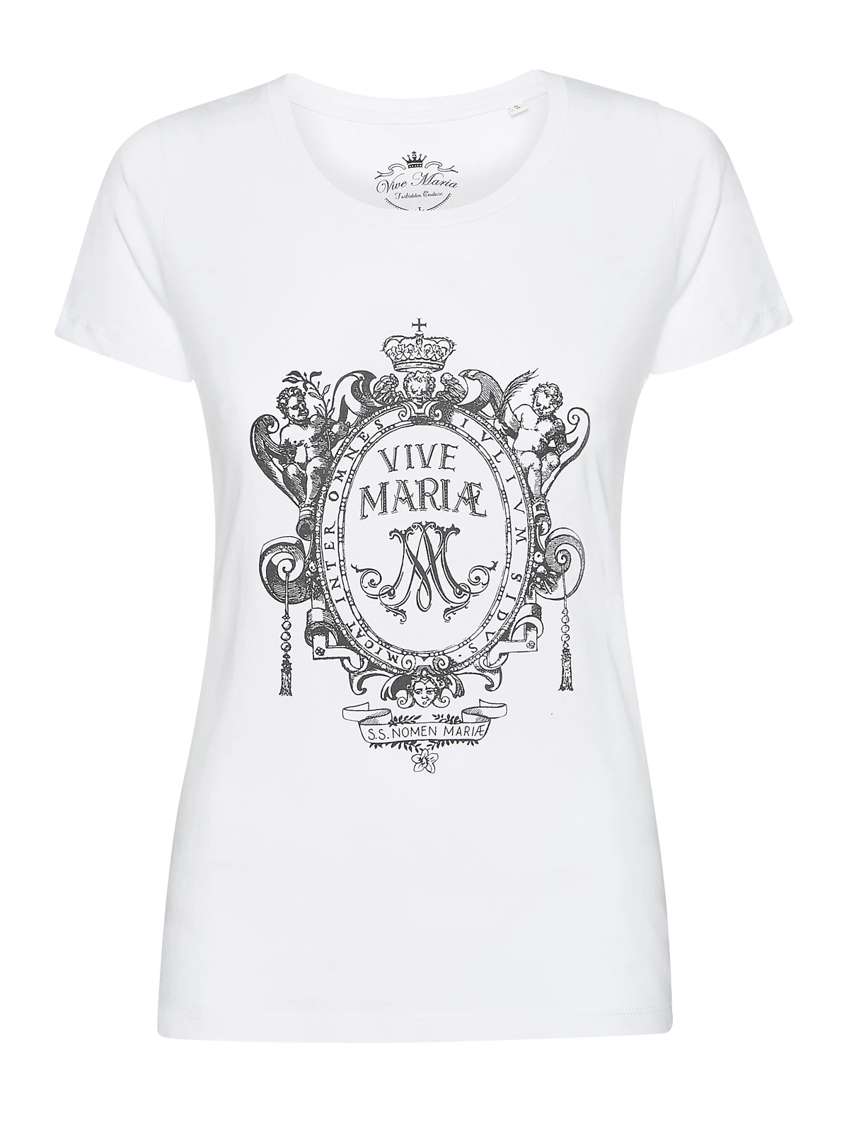 Back to the roots – mit der Vive Maria Heiligenkollektion Das coole Shirt zeigt das Vive Maria Logo im Baroque-Stil. Ein tolles Design, dass an die Anfangszeiten unseres Kult-Labels erinnert. Das beste daran, du bekommst das Shirt gleich in zwei Farben. Wähle zwischen schwarz und weiß, oder, falls du dich nicht entscheiden kannst, nimm einfach beide Modelle.