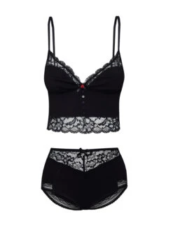 Das Vive Maria Wäscheset besteht aus einem Hemdchen und einem Höschen und ist aus einem angenehmen Materialmix aus Baumwolle und Modal. Die Spitze ist aus einem leichten Polyester-Elasthan-Gemisch – figurbetontes und kurzes Hemdchen mit verstellbaren Trägern – transparente Spitzeneinsätze am herzförmigen Ausschnitt und als unterer Saumabschluss – Satinschleife, rote Rose und kleine Verzierungen sorgen für einen aufregenden Look Länge in Gr. S ohne Träger ca. 28 cm – Höschen mit breitem Spitzenbund und Satinschleife – seitliche Spitzeneinsätze – Litze als Beinabschluss Vordere Länge bis Zwickelnaht ca. 31 cm
