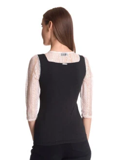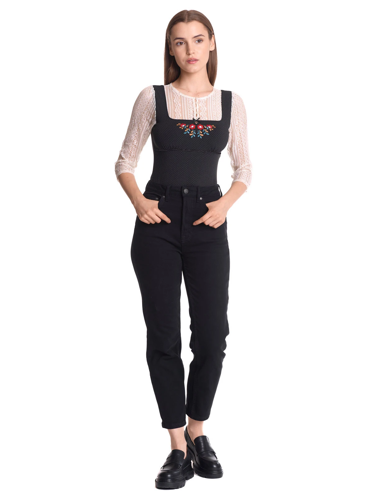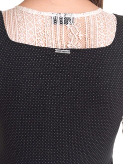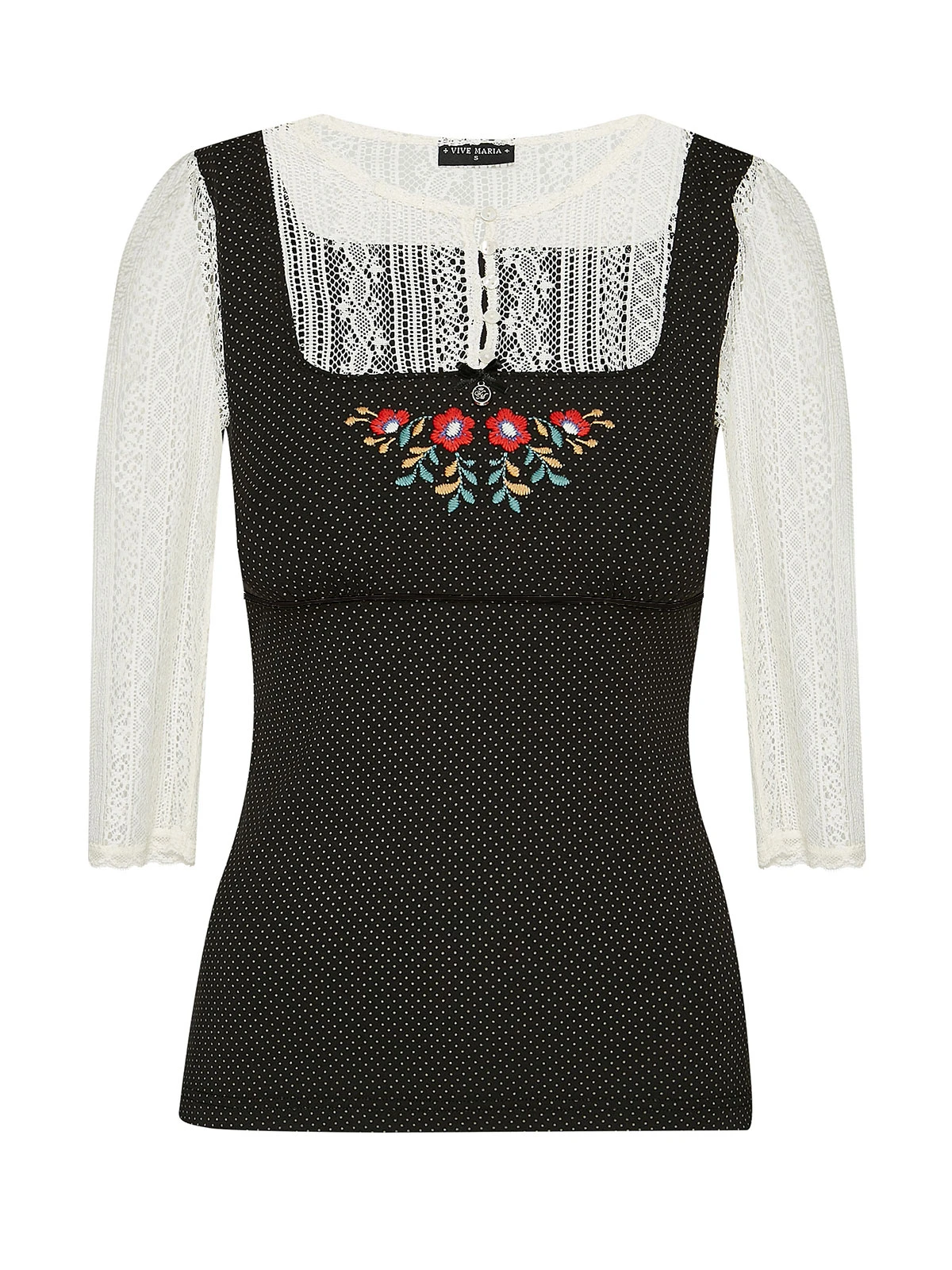 Meadow Girl mit Vive Maria Das traumhaft schöne Vive Maria Blusenshirt ist aus einem angenehmen Viskosematerial mit Elasthananteil. Die eingesetzte Spitze ist aus Polyester. Das Muster zeigt kleine Punkte auf schwarzem Stoff. Das Vive Maria Shirt ist figurbetont geschnitten. Die 3/4 langen Arme sowie ein Einsatz im oberen Bereich sind aus transparenter, cremefarbener Spitze. Der runde Halsausschnitt geht direkt in eine Knopfleiste ĂĽber. Eine Blumenstickerei sowie eine Satinschleife und ein Metallanhänger zieren den Dekolleteebereich. Eine Stretchpaspel dient als Unterbrustnaht und sorgt fĂĽr einen guten Sitz. Das ‚Meadow Girl‘ Shirt ist im Trachtenlook und wertet jedes Outfit auf. Ob Stoffhose oder Pencil Skirt – mit diesem Shirt liegst du immer richtig. Länge in Gr. S ca. 56 cm.