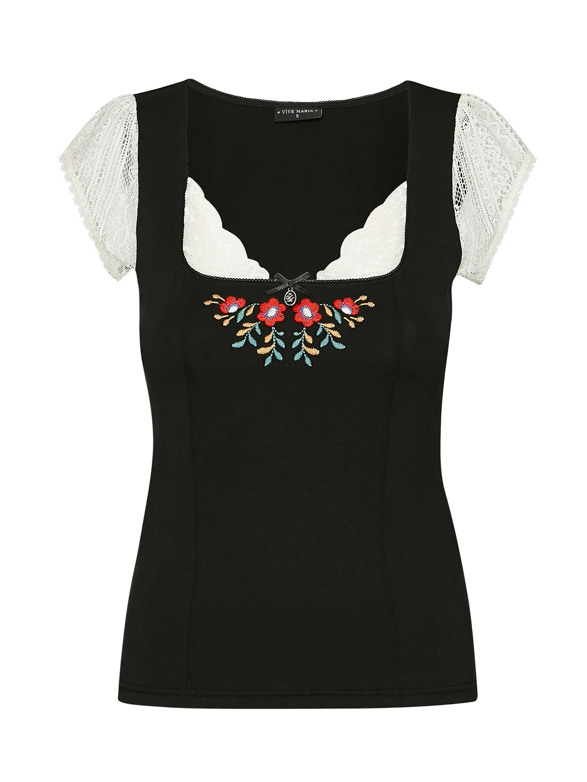 Meadow Kiss mit Vive Maria Das traumhaft schöne Vive Maria Top ist aus einem angenehmen Matererialmix aus Baumwolle und Elsathan. Die eingesetzte Spitze an den Ă„rmeln ist aus Polyester. die Spitze im Brustbereich ist aus einem Polyamid-Elasthan-Gemisch. Das Vive Maria Shirt ist figurbetont geschnitten, hat breite Träger und einen tiefen eckigen Ausschnitt. Der einsatz aus transparenter, cremefarbener Spitze bildet die Ă„rmel, sowie eine Verzierung im Dekolleteebereich. Dieser wird von einer Satinschleife und einem Metallanhänger geschmĂĽckt. Bunte Blumenstickerein im Brustbereich bilden das Highlight des Tops. Senkrecht verlaufende Ziernähte sorgen fĂĽr einen vorteilhaften Sitz. Das ‚MEadow Kiss Top‘ ist ein wirklich sĂĽĂźes Oberteil und peppt jedes Outfit auf. Es passt sowohl zum Rock, also auch zur Stoffhose oder zur Jeans. Ein absolutes Allroundtalent. Länge in Gr. S ca. 55 cm