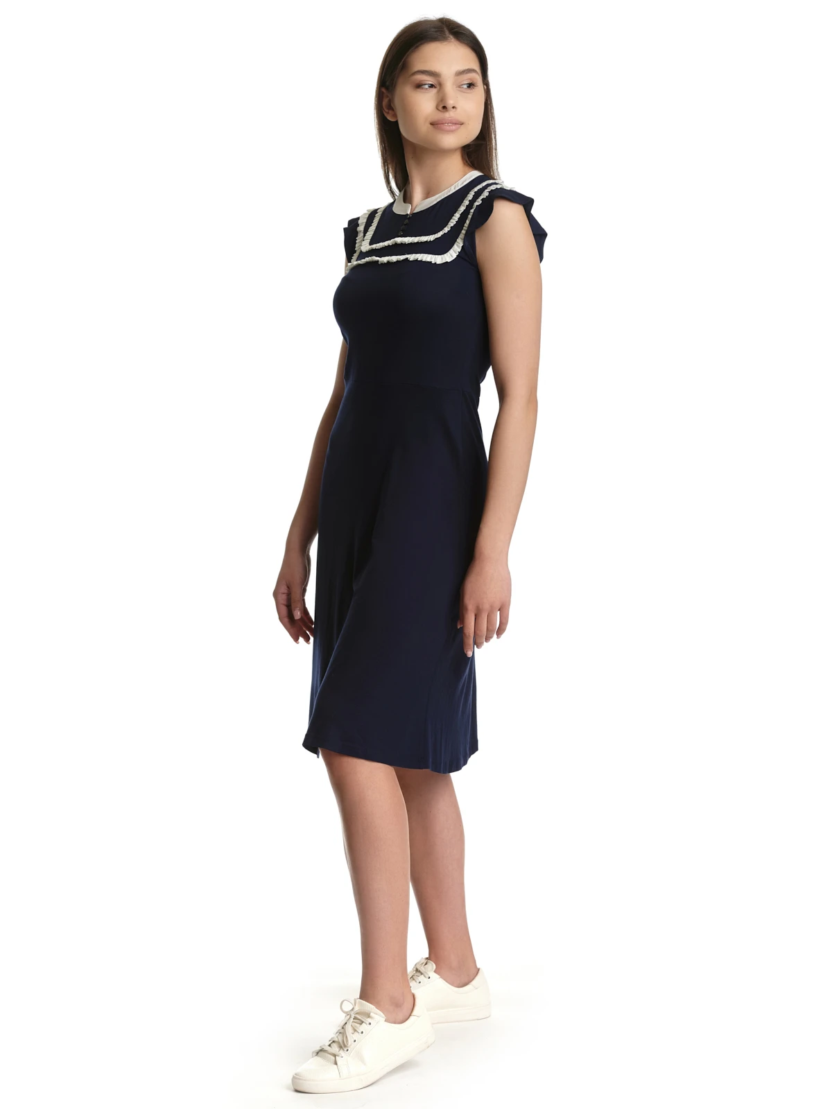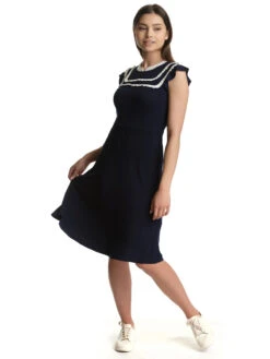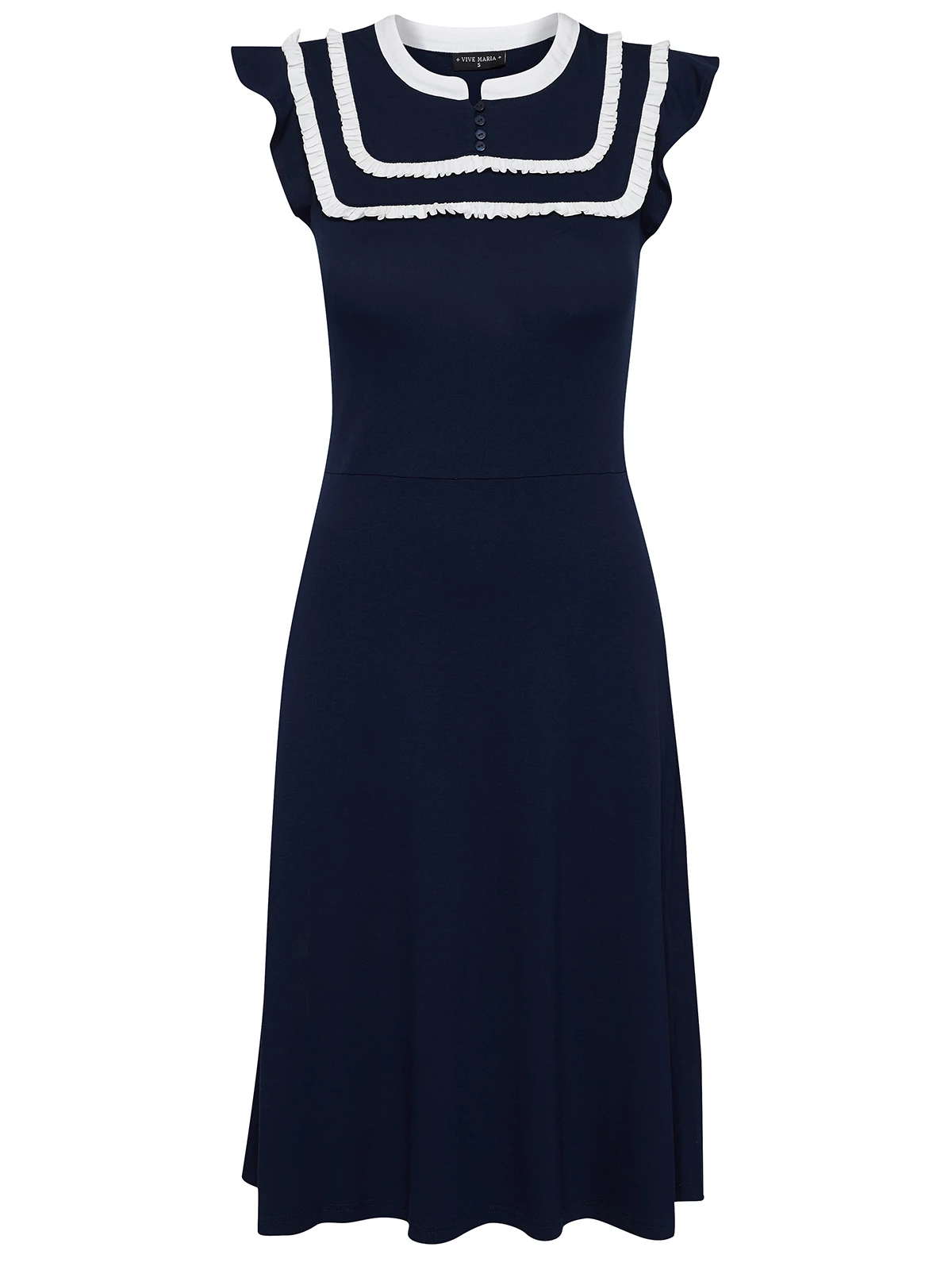 Mer Ahoy – Sommerfeeling und gedankliches Meeresrauschen mit der neuen ‚Mer‘-Serie von vive Maria Das tolle Vive Maria Kleid ist aus einem weichen Viskosematerial mit Elasthananteil und in sanfter A-Linie geschnitten. Ein schmaler Volant dient als Ă„rmelchen und der runde Halsausschnitt geht direkt in einen Stehkragen ĂĽber, der weiĂź abgesetzt ist und vorne mit einem Knopf geschlossen wird. Drei weitere Knöpfe zieren den Ausschnittbereich. Zwei Aufgesetze weiĂźe RĂĽschenreihen bilden einen optischen Kragen und unterstreichen den Sailor-Look. Eine Teilungsnaht auf Taillenhöhe trennt das figurbetonte Oberteil vom ausgestellten Rockteil, der angenehm um die Beine fällt. Die weiĂźen Details bilden einen tollen Kontrast zum ansonsten dunkelblauen Stoff. Das ‚Mer Ahoy‘ Kleid ist der perfekte Alltagsbegleiter, mit dem man sich an die cote d’azur träumen kann. Das Kleid passt hervorragend zu blauen Pumps oder sommerlichen Sandalen.