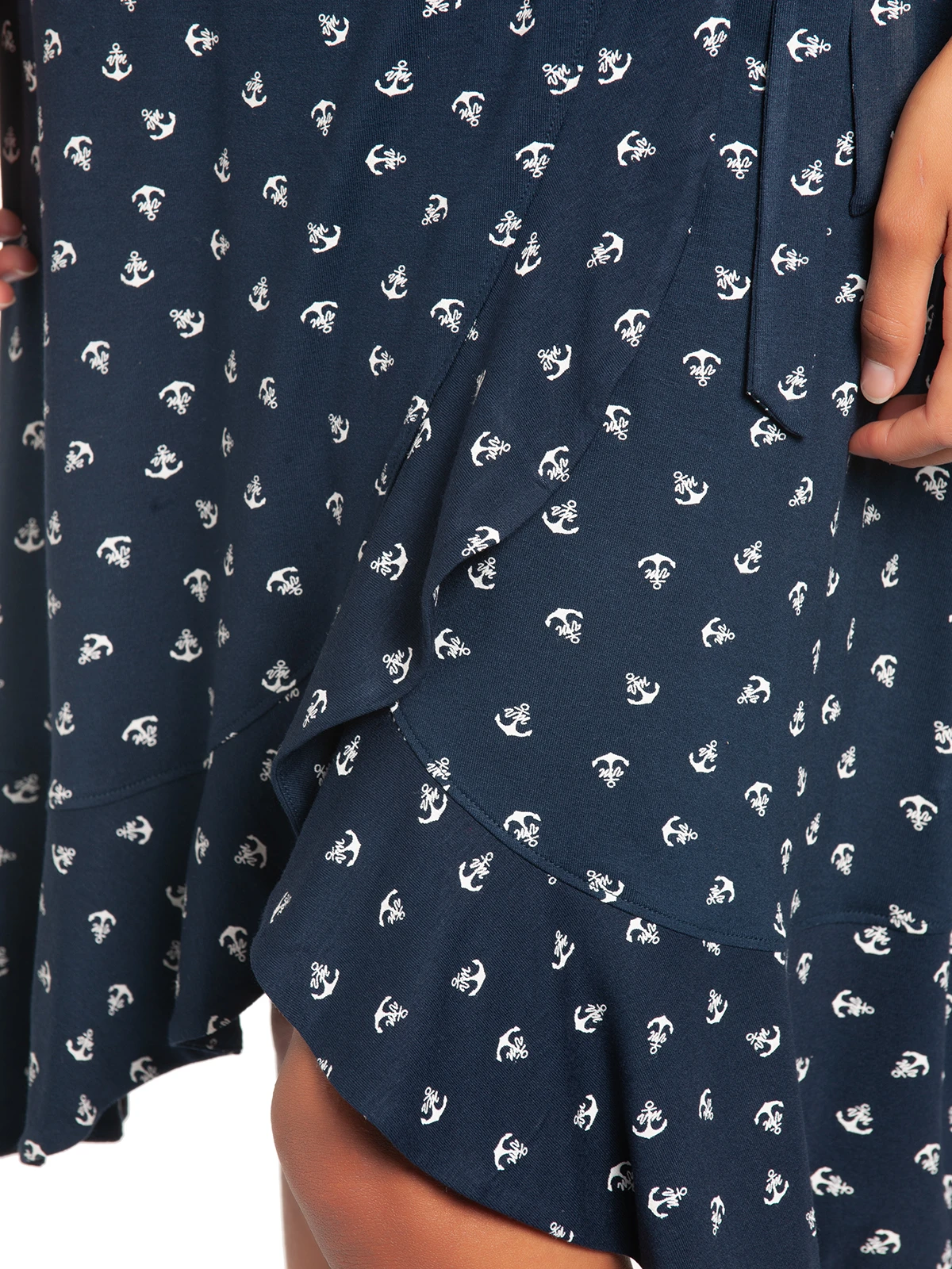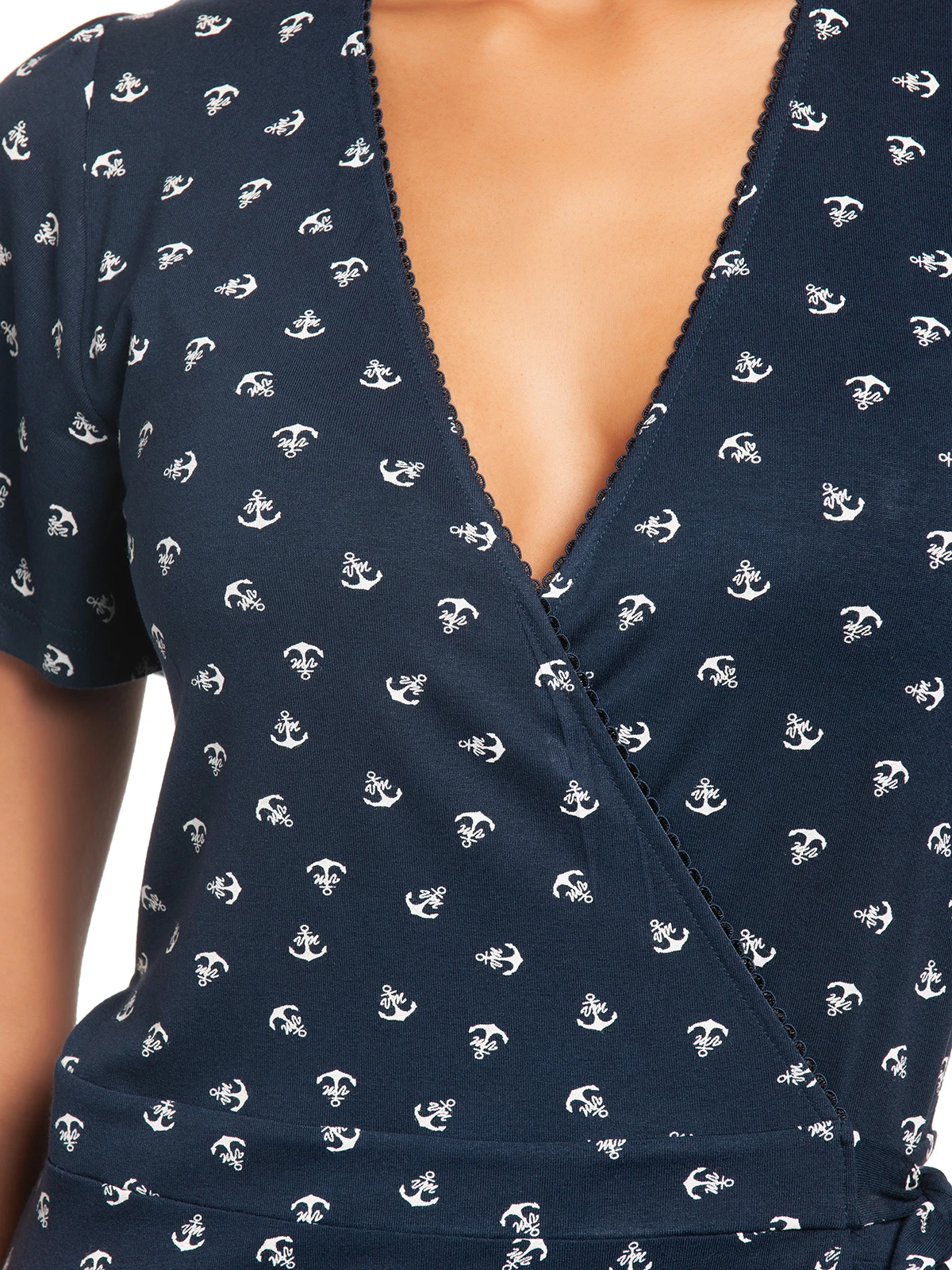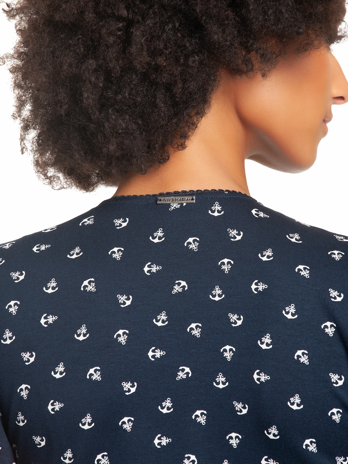 Mer Ahoy – Sommer-Feeling mit der ‚Mer‘-Serie von Vive Maria. Das traumhaft schöne Vive Maria Wickelkleid ist aus einem leichten Viskosematerial mit Elasthananteil. Es hat kurze, weitgeschnittene Arme und einen V-Ausschnitt der mit einer blauen Bogenlitze verziert ist. Das Kleid wird auf der linken Seite verknotet. Der unten angesetzte Volant ist ebenfalls mit einer Bogenlitze abgeschlossen und ist im vorderen Bereich abgerundet, sodass der Rockteil leicht auseinanderklafft und schön um die Beine fällt. Der Druck zeigt kleine Anker mit den Buchstaben ‚VM‘ auf blauem Stoff. Das ‚Mer D’Été‘ Kleid schmeichelt der weiblichen Silhouette und ist aufregend und extravagant. Es passt hervorragend zu Pumps oder Sandalen und ist ein toller Alltagsbegleiter für das Office.
