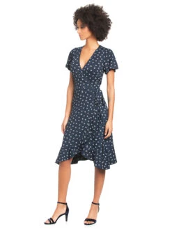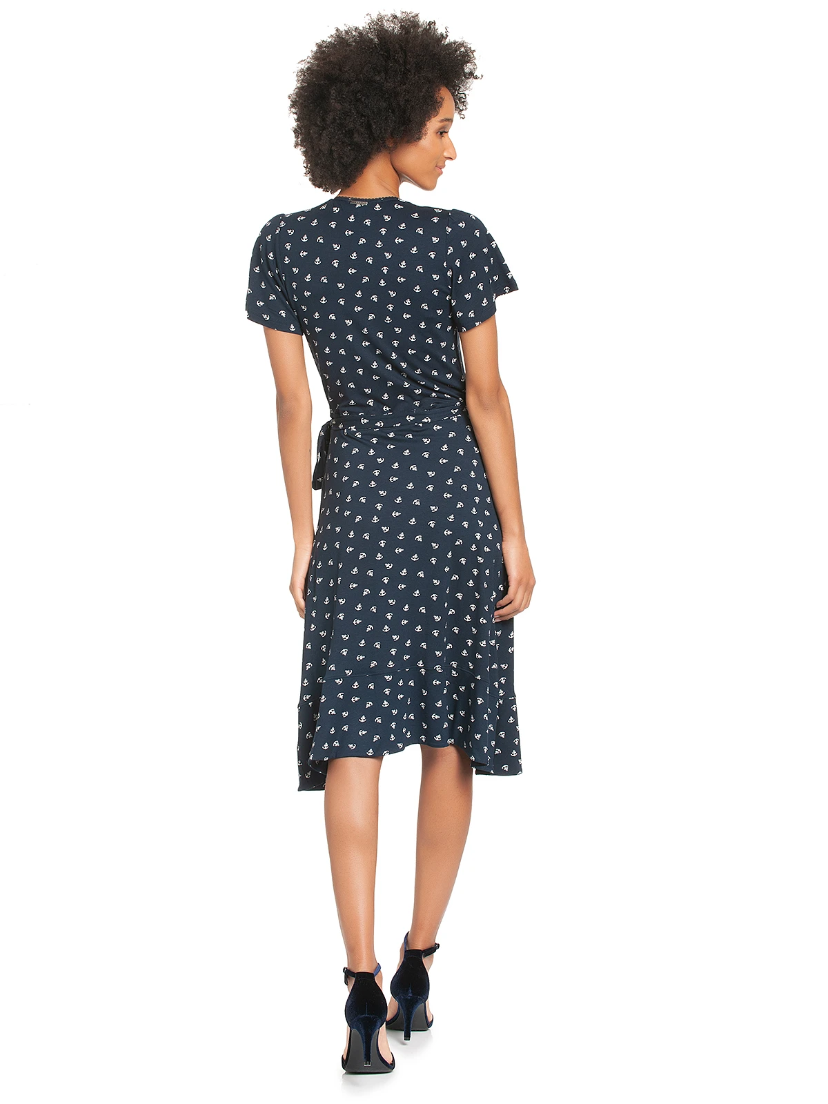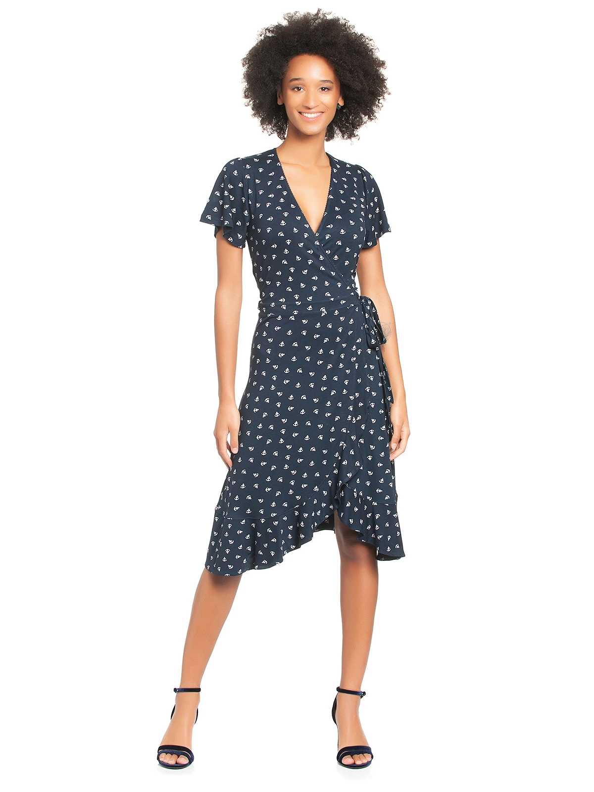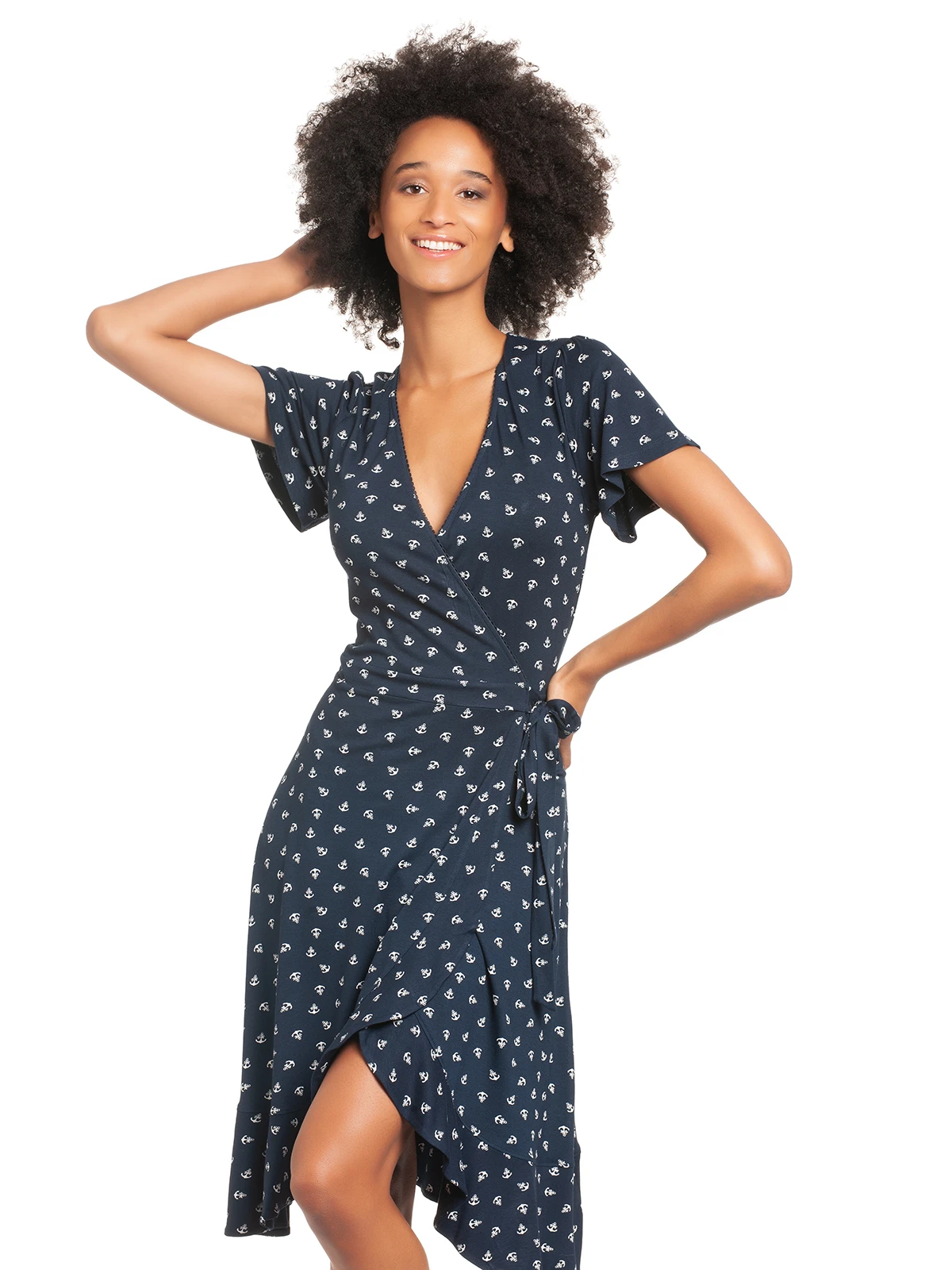 Mer Ahoy – Sommer-Feeling mit der ‚Mer‘-Serie von Vive Maria. Das traumhaft schöne Vive Maria Wickelkleid ist aus einem leichten Viskosematerial mit Elasthananteil. Es hat kurze, weitgeschnittene Arme und einen V-Ausschnitt der mit einer blauen Bogenlitze verziert ist. Das Kleid wird auf der linken Seite verknotet. Der unten angesetzte Volant ist ebenfalls mit einer Bogenlitze abgeschlossen und ist im vorderen Bereich abgerundet, sodass der Rockteil leicht auseinanderklafft und schön um die Beine fällt. Der Druck zeigt kleine Anker mit den Buchstaben ‚VM‘ auf blauem Stoff. Das ‚Mer D’Été‘ Kleid schmeichelt der weiblichen Silhouette und ist aufregend und extravagant. Es passt hervorragend zu Pumps oder Sandalen und ist ein toller Alltagsbegleiter für das Office.