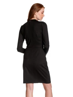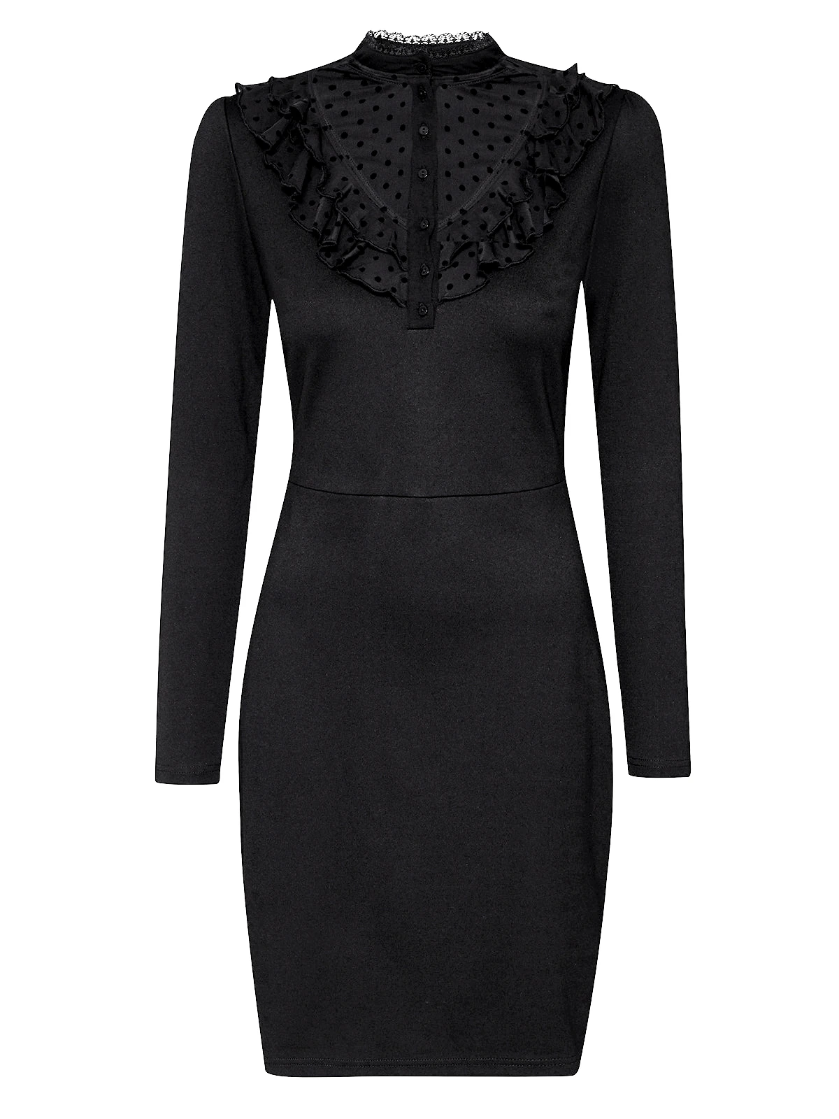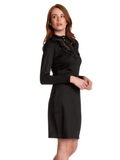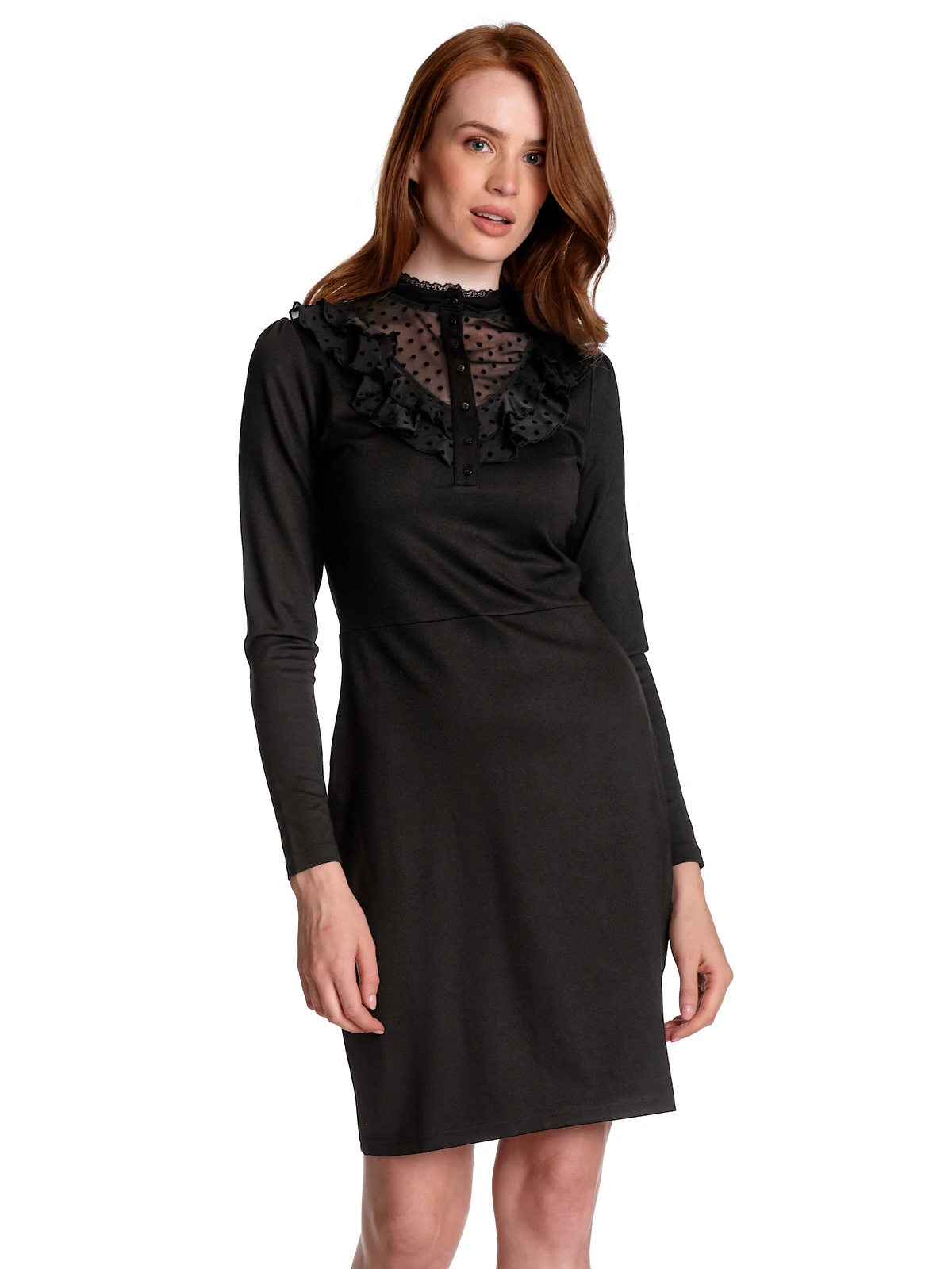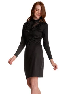 Das traumhaft schöne Vive Maria Kleid ist aus einem angenehmen Viskose-Polyestergemisch mit Elasthananteil. Der Tülleinsatz ist aus einem Polyester-Elasthangemisch. Das Kleid hat eine figurbetonte Passform und lange Arme. Der runde Halsausschnitt geht in einen Stehkragen über und wird mit einer schmalen Bordüre aus transparenter schwarzer Spitze abgeschlossen. Eine knopfleiste reicht bis etwa zur Brust. Der Brustbereich ist aus transparentem Pünktchentüll und wird zusätzlich mit zwei Volants, ebenfalls aus Pünktchentüll verziert. Eine Teilungsnaht auf Taillenhöhe trennt das figurbetonte Oberteil vom leicht ausgestellten Rockteil. Das Kleid ist unifarben schwarz. Das ‚Montmartre Black Dress‘ ist schlicht und edel und kann hervorragend mit Pumps oder Ankleboots kombiniert werden.