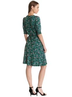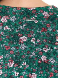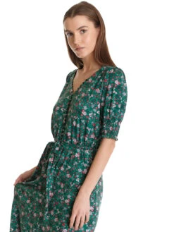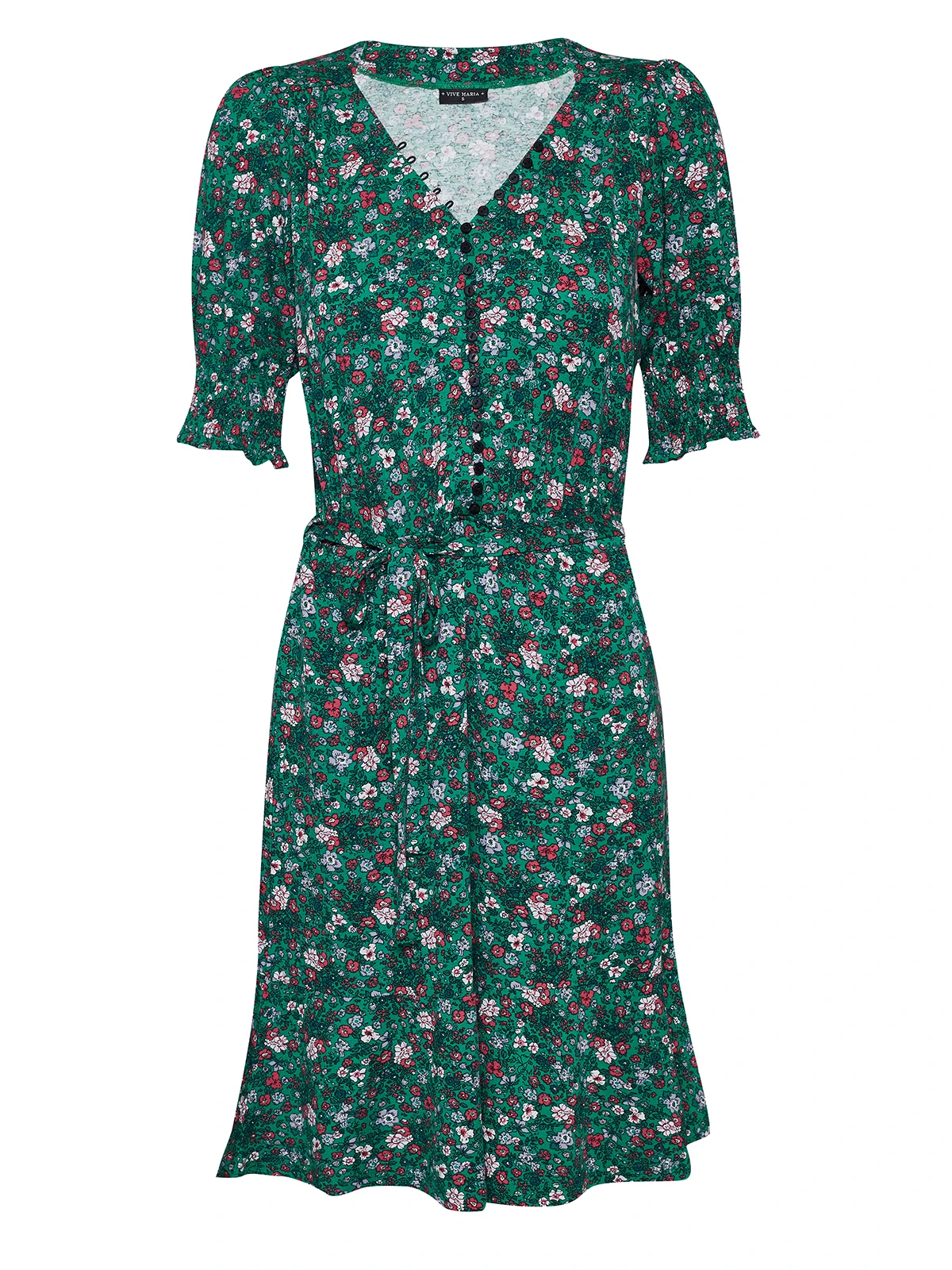 Vive Maria Kleid aus einem angenehmen Viskosematerial mit Elasthananteil, Blumenprint auf grünem Stoff – süßes Sommerkleid in leicht ausgestellter Passform – kurze Arme mit gesmoktem Armabschluss – V-Ausschnitt mit verlängerter Knopfleiste – Bindegürtel in Stofffarbe – angesetzer Volant für einen glockigen Fall Länge in Gr. S ca. 97 cm