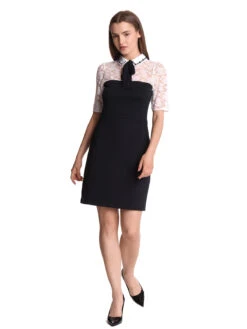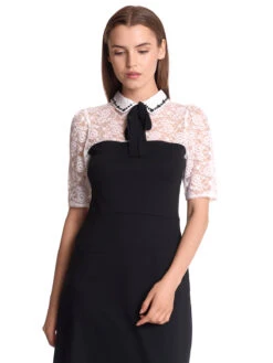 My Melody – mit Vive Maria Das traumhaft schöne Kleid ist figurbetont geschnitten und setzt sich aus unteschiedlichen Materialien zusammen. Die cremefarbene Spitze im Oberteil ist aus einem angenehmen Polyester-Elasthan-Gemisch, der Blusenkragen ist aus Viskose, das restliche Kleid ist aus einem Viskose-Polyester-Elasthan-Gemisch, der Futterstoff im Rockteil aus Polyester. Das Kleid hat halblange Arme, einen Blusenkragen mit einer verspielten Stickerei, sowie einem Bindeband. Ab dem Brustbereich ist das Kleid unfifarben schwarz. Eine Teilungsnaht auf Taillenhöhe trennt das Oberteil optisch vom Rockteil, der UnterfĂĽttert ist. Aufgesetzte Taschen lockern das Gesamtbild auf. Ein ReiĂźverschluss im RĂĽckenbereich erleichtert das An- und Ausziehen. Das ‚My Melody‘ Dress ĂĽberzeugt mit schlichter Eleganz und passt sowohl zur Cocktailparty als auch zum festlichen Dinner. FĂĽr alle, die nicht gerne Kleider tragen ist die ‚My Melody‘ Blouse eine gute Alternative. Länge in Gr. S ca. 89 cm.