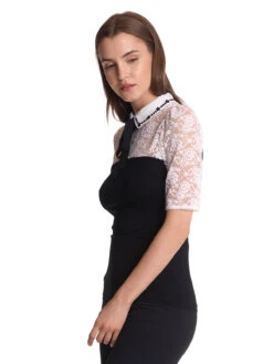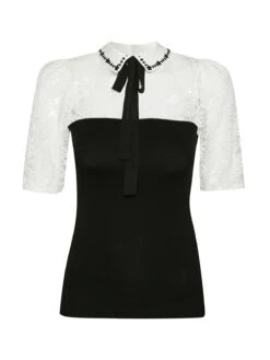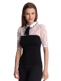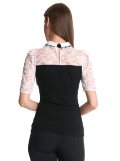 My Melody mit Vive Maria Das wunderschöne Vive Maria Blusenshirt ist aus einem tollen Materialmix. Die cremefarbene Spitze im oberen Bereich ist aus einem Polyester-Elasthan-Gemisch, der Blusenkragen aus Viskose. Das dazugehörige Bindeband ist aus Polyester und das restliche Oberteil ist angenehmer Viskose mit Elasthananteil. Das Oberteil ist figurbetont geschnitten und hat halblange Arme. Der runde Halsausschnitt geht in einen Blusenkragen über, der im Nackenbereich mit zwei Knöpfen geschlossen wird und vorne bestickt ist. Ein Bindeband führt unter dem Kragen durch und wird vorne zu einer Schleife gebunden. Ab dem Brustbereich ist das Blusenshirt unifarben schwarz. Die ‚My Melody‘ Blouse von Vive Maria passt hervorragend zur schwarzen Stoffhose oder auch zum Pencil Skirt. Länge in Gr. S ca. 58 cm.