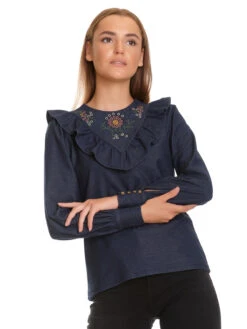 Die coole Vive Maria Shirtbluse ist aus einem angenehmen Materialgemisch aus Baumwolle, Polyester und Elasthan. Sie hat eine gerade Passform und lange Ärmel, die mit breiten Manschetten abgeschlossen werden. Diese werden mit Knöpfen und einer Gummischlaufe geschlossen. Der runde Halsausschnitt wird im Nackenbereich ebenfalls mit einem kleinen Knopf geschlossen, sodass ein Guckloch entsteht. Der vordere Bereich ist mit einer bunten Blumnstickerei versehen und ein aufgesetzer Volant ziert den Brust- sowie den hinteren Schulterbereich und lockert die Shirtbluse optisch auf. Der Stoff ist denimfarben. Die ‚Nevada Denim Blouse‘ ist der perfekte Begleiter für die kalte Jahreszeit und kann sich sowhl beim gemütlichen Abend mit Freunden als auch beim Restaurantbesuch sehen lassen. Sie besetzt eine romantische Leichtigkeit und wertet jedes Outfit auf.