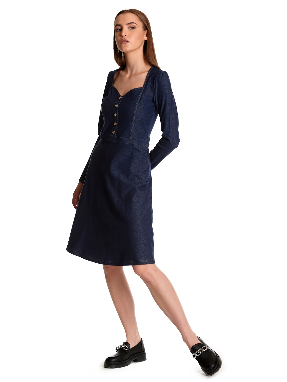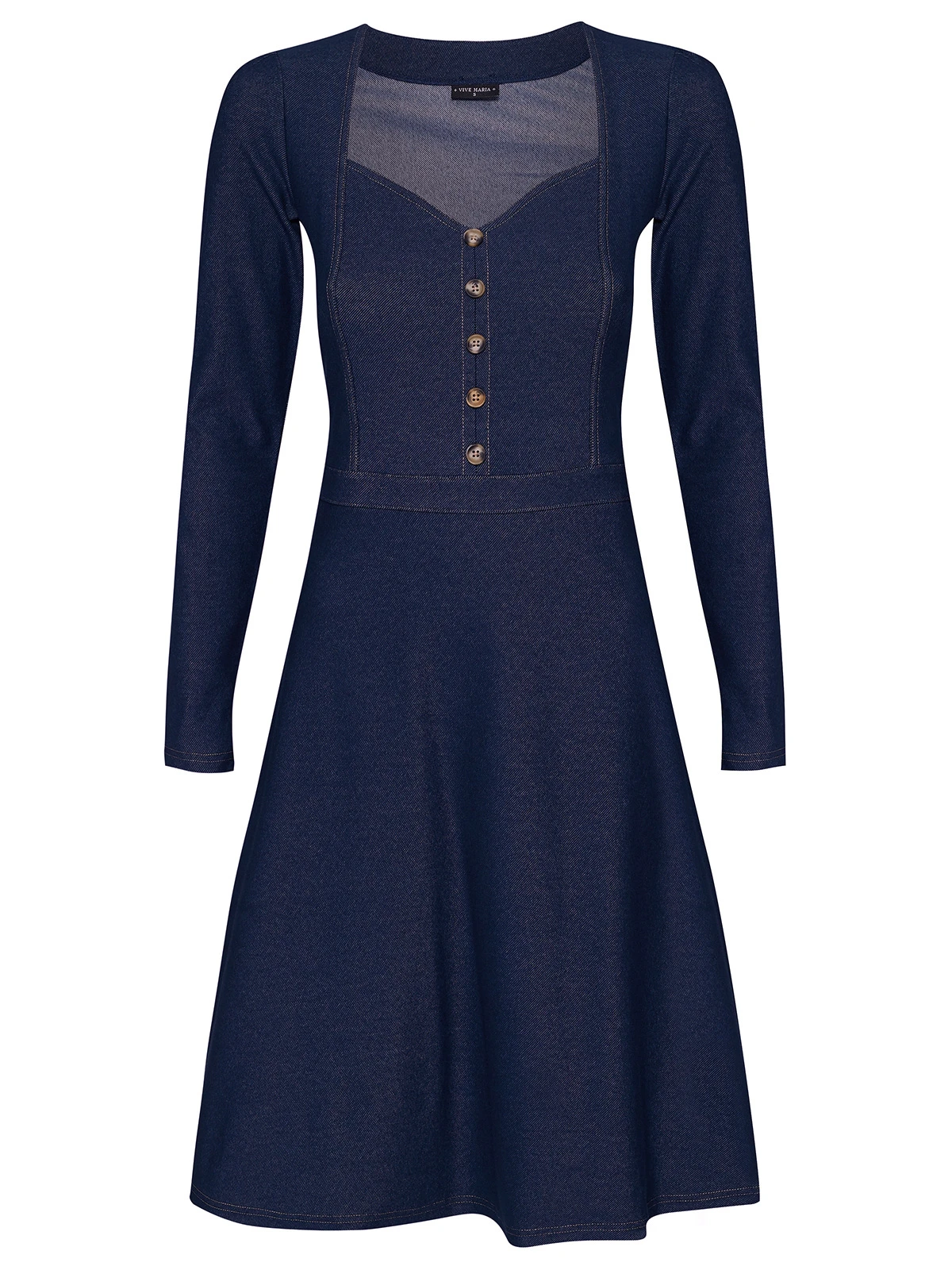 Das traumhaft schöne Vive Maria Kleid ist aus einem angenehmen Baumwoll-Polyester-Elasthangemisch. Der Futterstoff im Rockteil ist aus Polyester und sorgt für einen angenehmen Sitz. Das Kleid hat eine leicht ausgestellte Passform, lange Arme und einen herzförmigen Ausschnitt. Braune Zierknöpfe und Ziernähte lockern das Kleid optisch auf. Der Stoff ist in Denimoptik. Das ‚Nevada Girl Denim Dress‘ passt super gut zu braunen Stiefeletten oder Pumps.
