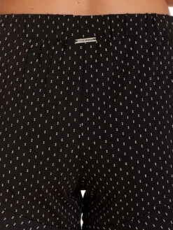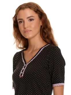 Der traumhaft schöne Vive Maria Pyjama ist aus einem angenehmen Viskosematerial mit Elasthananteil und besteht aus zwei Teilen. Der Druck zeigt kleine weiße Pünktchen in zweieranordnung auf schwarzem Stoff. Das figurbetonte Oberteil hat kurze Arme, die mit einer schmalen Bordüre aus transparenter lila Spitze abgeschlossen werden. Der V-Ausschnitt ist mit einem schwarzen Einfassband sowie lilafarbener Spitze abgeschlossen. Eine Zierknopfleiste und eine lilafarbene Satinschleife zieren den vorderen Bereich. Die Pyjamahose hat einen breiten Gummibund und ein schwarzes Bindeband, zur zusätzlichen Weitenregulierung. Die kurzen Hosenbein werden mit einem angesetzen Volant abgeschlossen und sind seitlich mit einer kleinen lilafarbenen Satinschleife verziert. Oberteil Länge in Gr. S ca. 58 cm Hose Innenbeinlänge in Gr. S ca. 12 cm