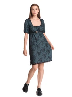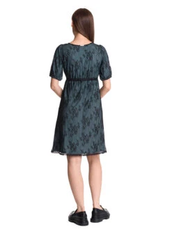 Regency mit Vive Maria Das süße Vive Maria Kleid ist aus einem angenehmen Viskosematerial. Die Spitze über dem Kleid sit aus Polyamid. Der Futterstoff ist in Goblin Blau, die darübergelegte Spitze ist schwarz. Das Kleid ist gerade, im Babydoll-Stil geschnitten. Es hat kurze Arme, die mit einem breiten Gummizug abgeschlossen werden. Der große runde Halsausschnitt hat kleine Raffungen im Dekolleteebereich. Ein Satinband mit eingezogenem Gummi dient als Unterbrustnaht, das mit einer Blumen-Stick-Applikation verziert ist. Die transparente Spitze ist etwas länger als das Unterkleid. Das Regency Kleid überzeugt mit schlichter Eleganz und passt hervorragend zu schwarzen Ankleboots. Eine kurze, feine Lederjacke sorgt für einen tollen Kontrast. Länge in Gr. S ca. 92 cm.