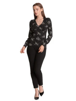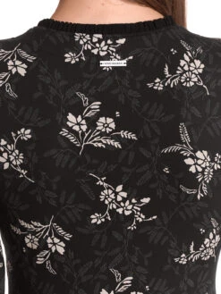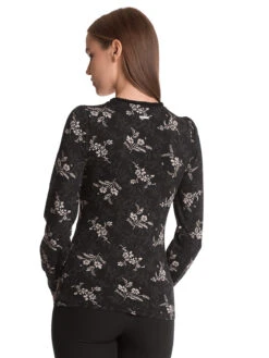 Reverie mit Vive Maria Das süße Vive Maria Shirt ist aus einem angenehmen Viskosematerial mit Elasthananteil. Die angesetzte Rüsche ist aus Viskose. Das Shirt ist figurbetont geschnitten und hat lange Arme, sowie einen V-ausschnitt, der in eine Knopfleiste übergeht. Die Schulterpatte wird mit einem Rüschenband verziert. Eine Stretchpaspel dient als Unterbrustnaht und sorgt für einen guten Sitz. Das Muster zeigt ein helles Blumenmuster auf schwarzem Stoff. Das ‚Reverie‘ Shirt überzuegt mit schlichter Eleganz und passt hervorragend zu Jeans und Stiefeletten. Länge in Gr. S ca. 58 cm.