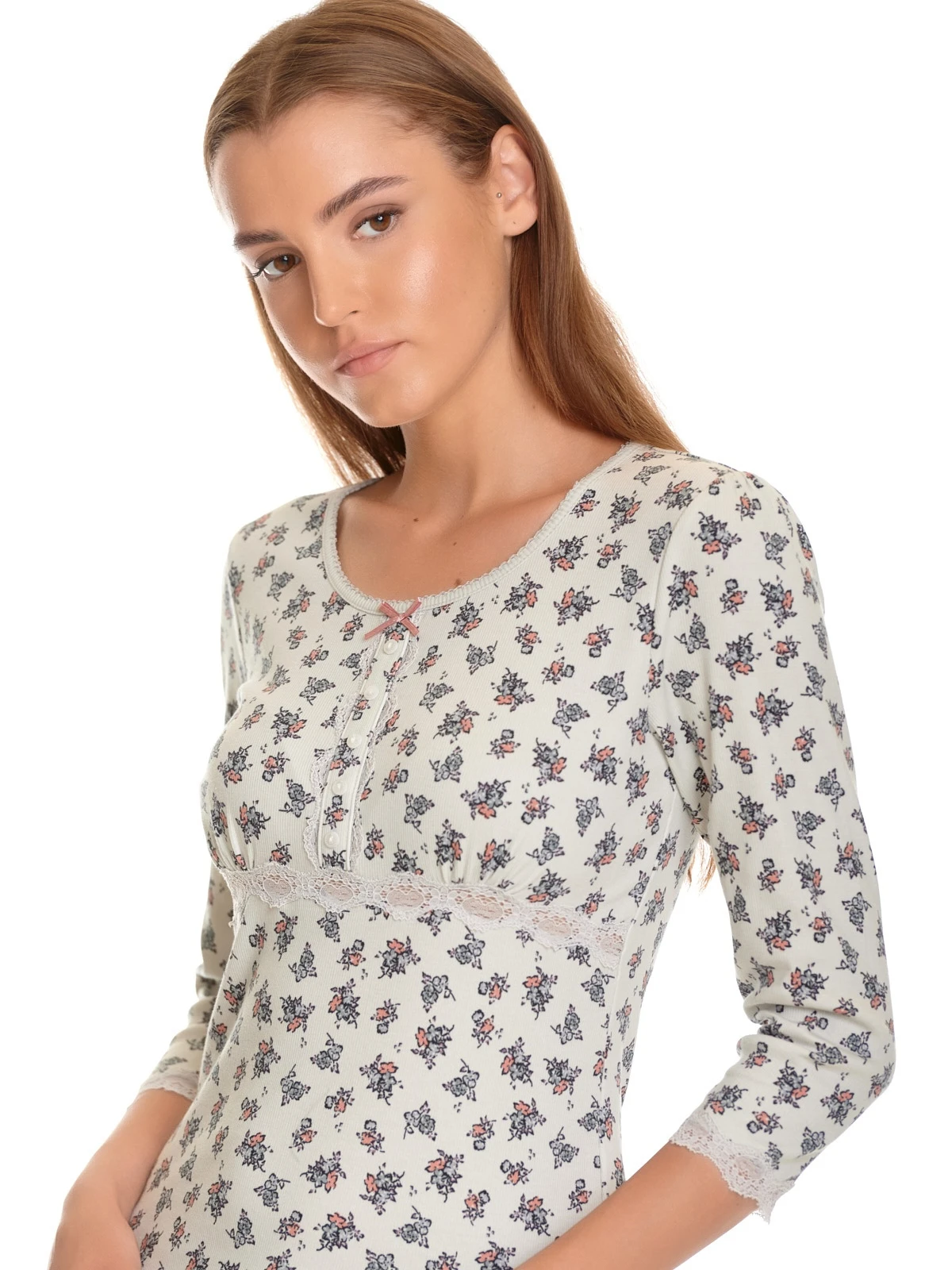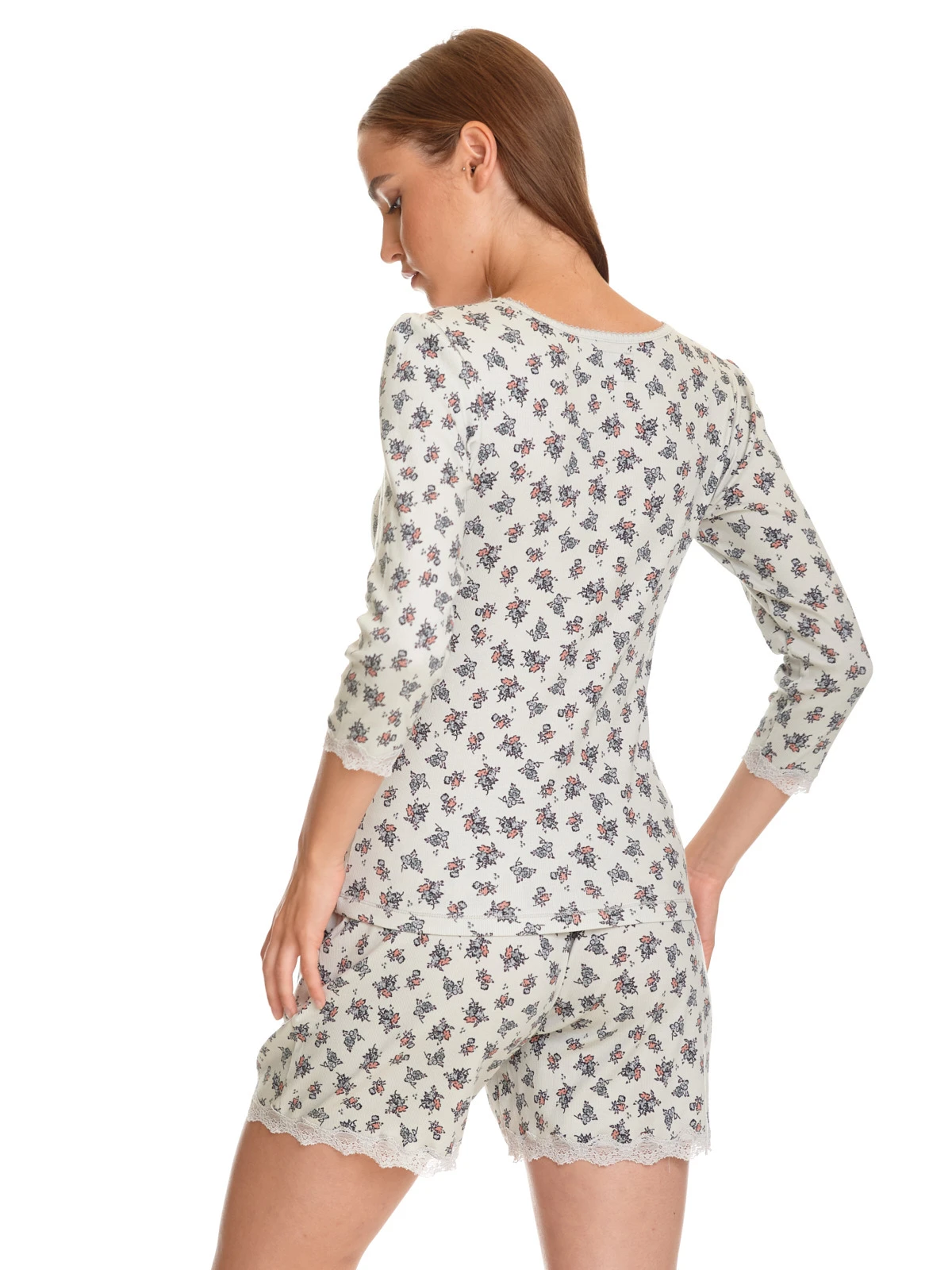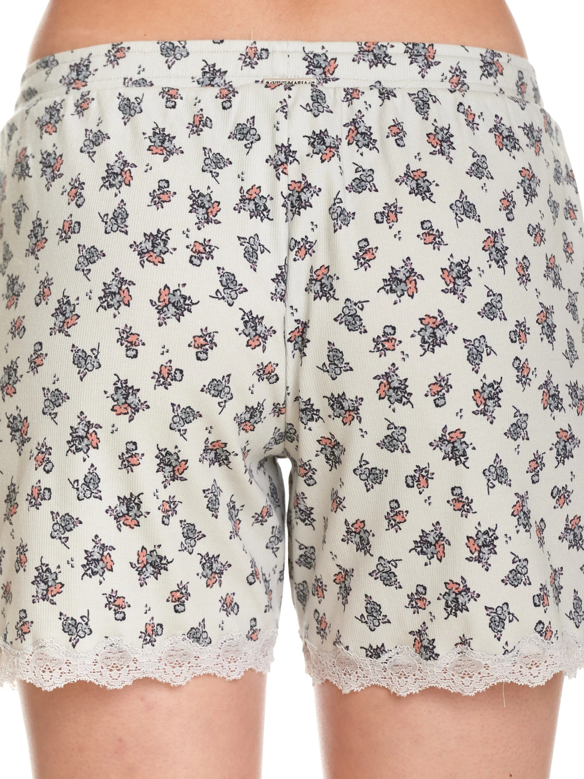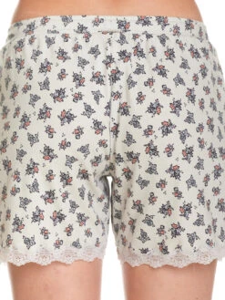 Der süße Vive Maria Pyjama ist aus einem feinen hellgrauen Rippstoff mit Blumendruck und aus einem angenehmen Baumwollmaterial mit Elasthananteil. Der Pyjama besteht aus zwei Teilen. Das figurbetonte Oberteil hat 3/4 lange Ärmel, die mit einer Bordüre aus transparenter Spitze abgeschlossen werden. Der runde Halsausschnitt ist mit einem Einfassband sowie einer angehäkelten Litze abgeschlossen. Eine Zierknopfleiste ist mit einer rosafarbenen Satinschleife geschmückt und mit hellgrauer Spitze gesäumt. Eine Unterbrustnaht, ebenfalls aus Spitze, sorgt für einen guten Sitz. Die Hose hat einen schmalen Gummibund und ein eingezogenes Bindeband, dass der zusätzlichen Weitenregulierung dient. Seitliche Eingrifftaschen sorgen für einen bequemen Look. Die kurzen Hosenbeine werden mit einer Bordüre aus transparenter grauer Spitze abgeschlossen. Oberteil Länge in Gr. S ca. 58 cm Hose Innenbeinlänge in Gr. S ca. 13 cm.