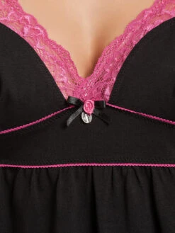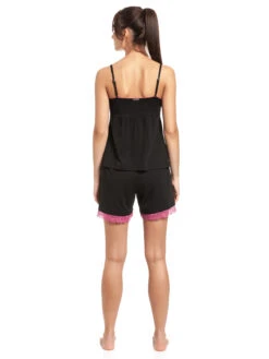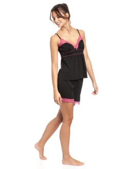 Der süße Vive Maria Pyjama besteht aus zwei Teilen und ist aus einem angenehmen Baumwollmaterial mit Elasthananteil. Ober- und Unterteil sind unifarben schwarz, die Spitze sowie die Träger setzten sich in pink ab. Das Oberteil hat dünne verstellbare Träger und einen tiefen V-Ausschnitt, der mit einer Bordüre aus transparenter Spitze verziert ist. Der Dekolleteebereich wird mit einer kleinen Satinrose, einer Satinschleife sowie einem Metallanhänger geschmückt. Eine Zick-Zack-Litze bildet neben verzierungen der Cups auch eine Unterbrustnaht sowie eine Teilungsnaht. Das Hemdchen ist im Brustbereich enganliegend geschnitten und fällt dann schön locker. Länge in Gröpe S ohne Träger ca. 45 cm. Die kurze Pyjamashort hat einen breiten Gummibund, der für einen bequemen Sitz sorgt. Ein eingezogenes Bindeband dient der zusätzlichen Weitenregulierung. Die kurzen Hosenbeine werden mit einer Bordüre aus transparenter Spitze abgeschlossen. Innenbeinlänge in Größe S ca. 13 cm. Der ‚Sugar Girl Short Pyjama‘ ist eine tolle Kombination aus angenehmen Stoff und tollen Farben. Die pinken Akzente setzen sich wunderbar vom schwarzen Stoff ab und bilden schöne Highlights. Ein wirklich süßer Pyjama der für traumhaft schöne Nächte sorgt.