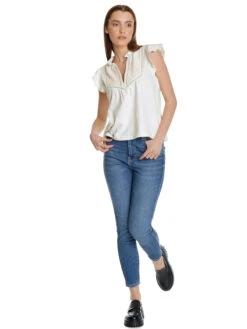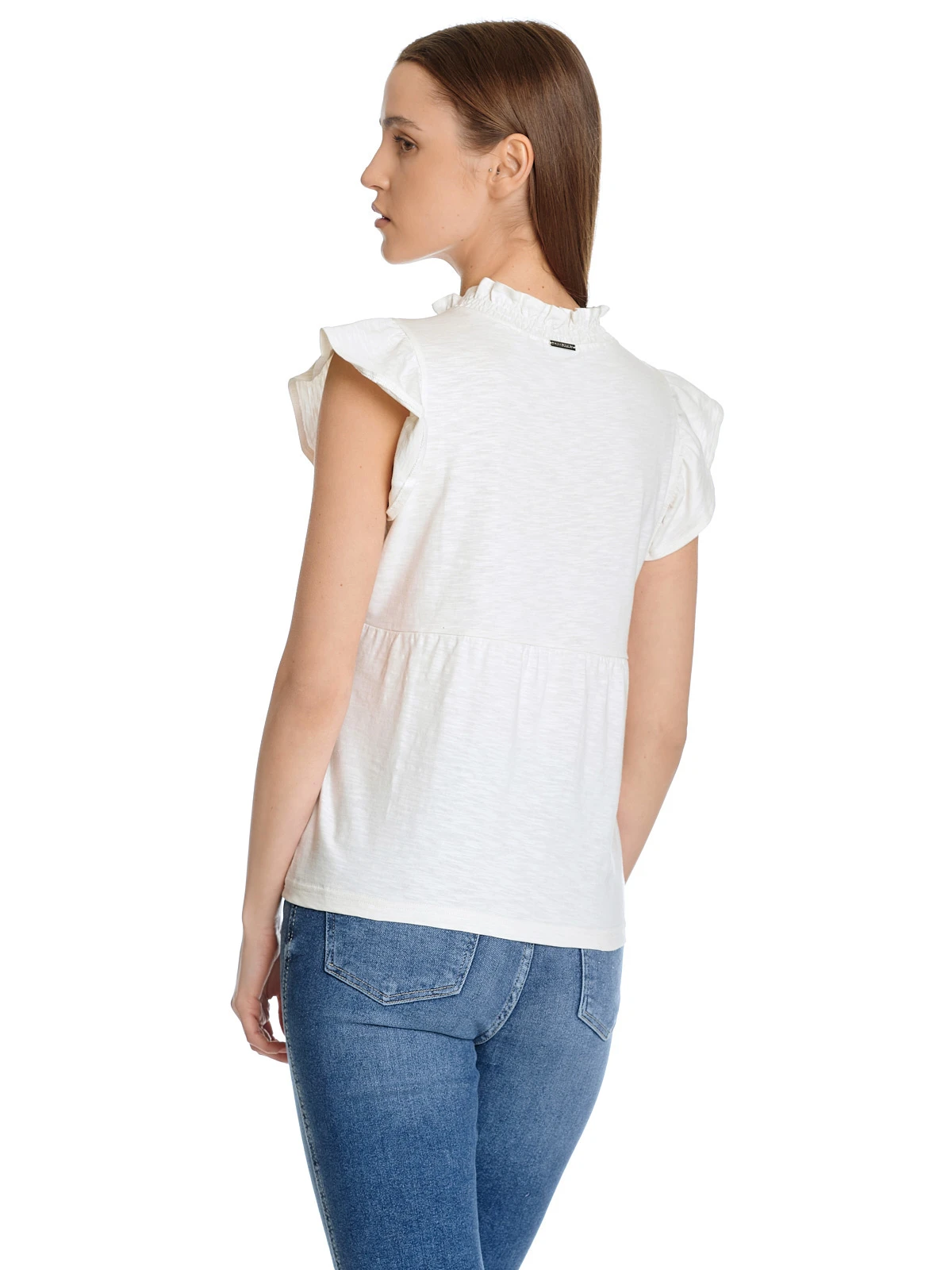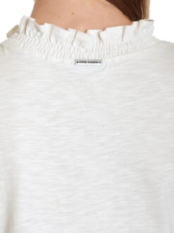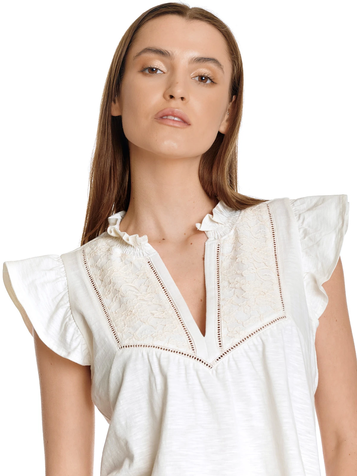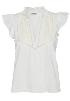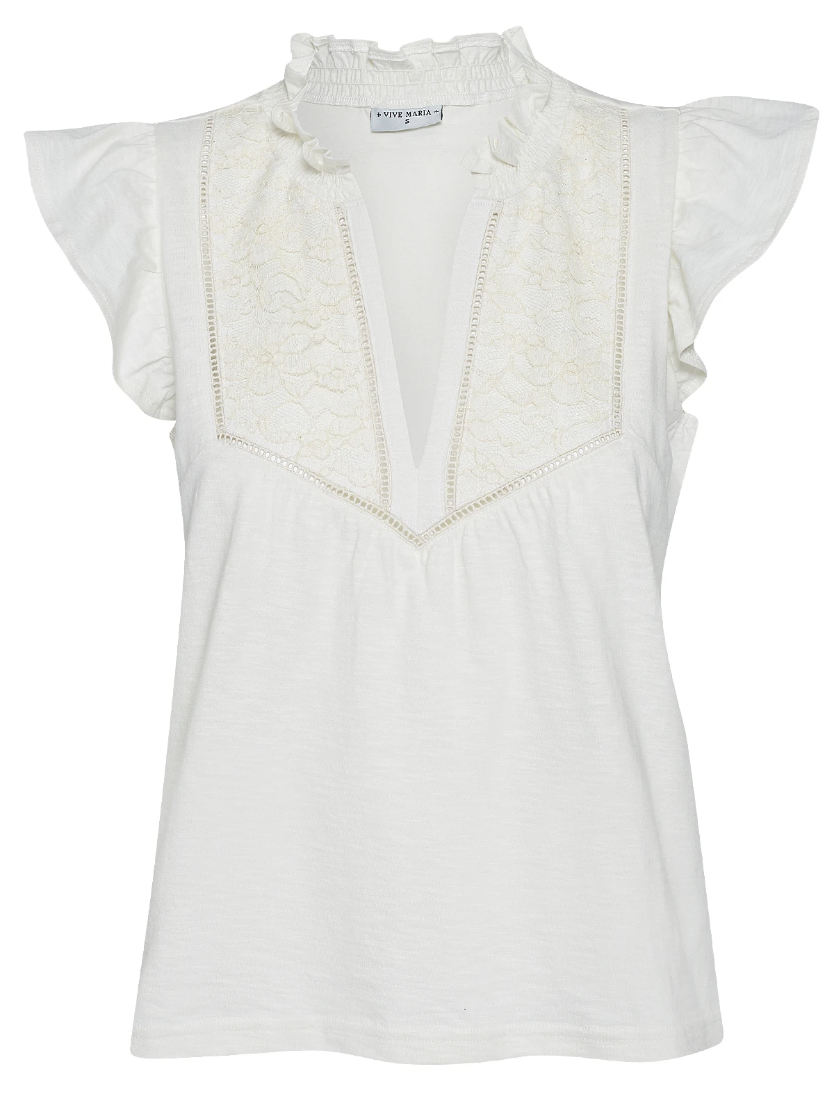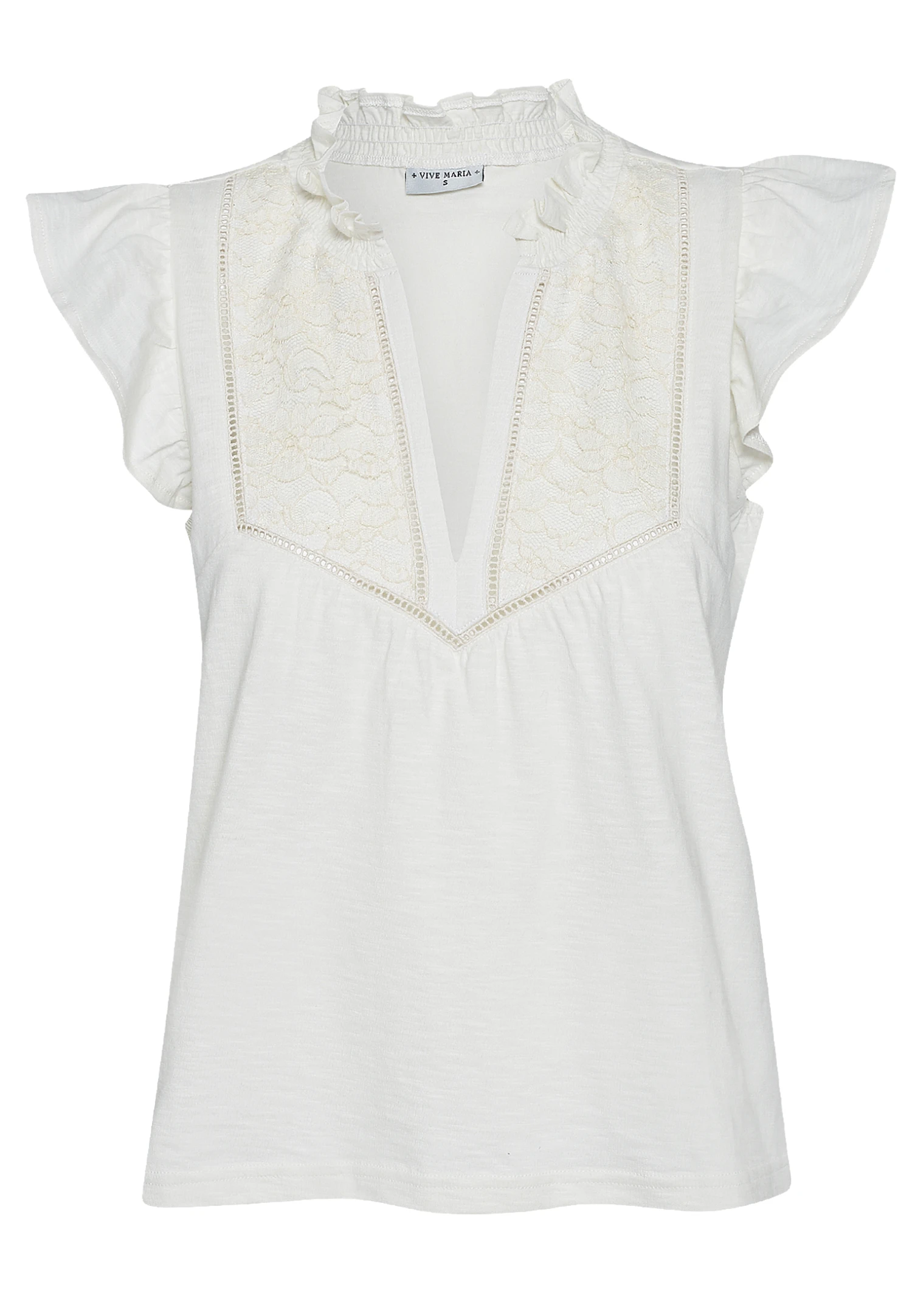 Das süße Vive Maria Blusentop ist aus einem angenehmen Bio-Baumwollmaterial und unifarben creme – lockeres Blusentop mit gerader Passform – kurze Ärmel mit angekrauster Weite – runder Halsausschnitt mit Rüschen-Stehkragen, vorne geöffnet bis zum Dekolleteebereich – Einsatz von Spitze und Lochspitze im Brustbereich – auch in schwarz erhältlich Achtung: nicht dehnbar Länge in Gr. S ca. 58 cm