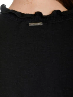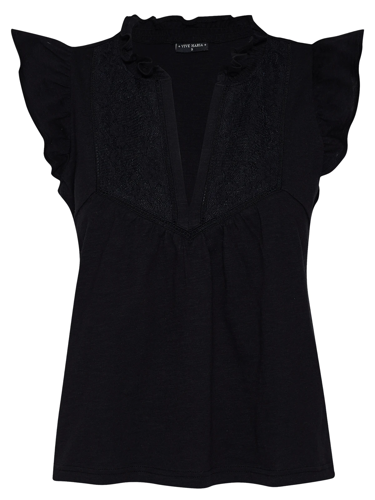 Das süße Vive Maria Blusentop ist aus einem angenehmen Bio-Baumwollmaterial und unifarben schwarz – lockeres Blusentop mit gerader Passform – kurze Ärmel mit angekrauster Weite – runder Halsausschnitt mit Rüschen-Stehkragen, vorne geöffnet bis zum Dekolleteebereich – Einsatz von Spitze und Lochspitze im Brustbereich – auch in creme erhältlich Länge in Gr. S ca. 58 cm