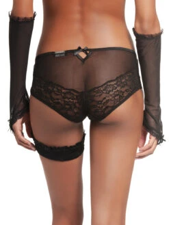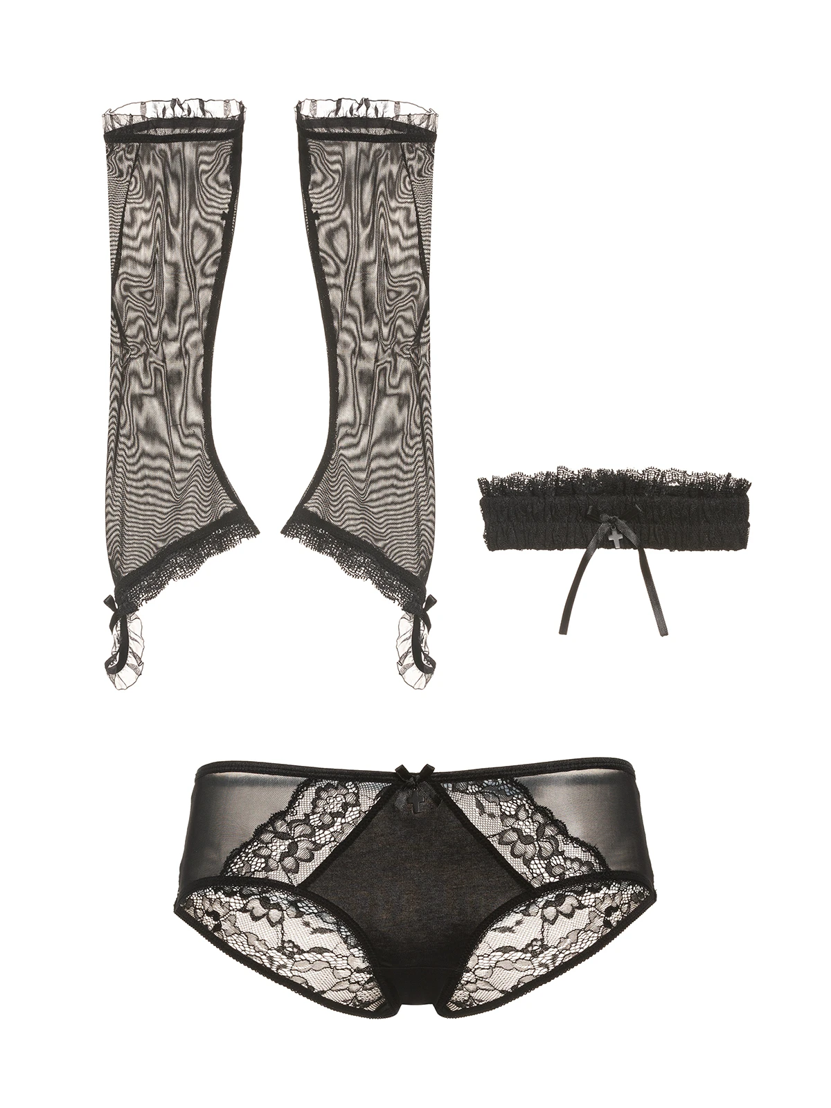 Das perfekte Geschenk – verfĂĽhrerische Accessoires! Dieses extravagante Accessoire-Set besteht aus einer Panty, einem Paar TĂĽllhandschuhen und einem Strumpfband. Das Trio ist in mysthischem Schwarz gehalten. Die Panty besteht aus einem transparentem TĂĽllmaterial und hat einen blickdichten Baumwolleinsatz vorne. Der elastische Bund wird von einer schwarzen Satinschleife mit einem Kreuzanhänger verziert. Transparente Spitzeneinsätze sorgen fĂĽr einen besonders detailverliebten Look. (Vordere Länge bis Zwickelnaht ca. 24 cm.) Die schwarzen Handschuhe bestehen ebenfalls aus einem transparenten TĂĽllmaterial. Eine schmale RĂĽsche ziert den oberen Bund während zarte Spitze den unteren Teil verziert und die Fingerschlaufe bildet. Kleine schwarze Satinschleifen runden die Handschuhe ab. Das elastische Strumpfband besteht aus gesmokter schwarzer Spitze. Ein weiteres Spitzenband oben sowie eine schwarze Schleife mit verspielten langen Enden machen dieses Accessoires besonders elegant.