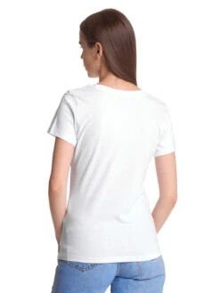 Dieses schwarze Damen T-Shirt besteht aus einem angenehmen, hochwertigen Bio-Baumwollmaterial. Es hat einen runden Halsausschnitt, kurze Ärmel und ist figurbetont geschnitten.