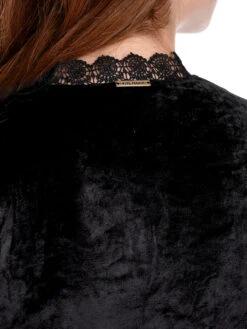 Das traumhaft schöne Vive Maria Kleid ist aus einem angenehmen Viskosematerial mit Polyesteranteil. Der Futterstoff ist aus Polyester. Es ist figurnaht und in leichter A-Linie geschnitten. Das Kleid hat lange Arme, die mit breiten Manschetten und einer SpitzenbordĂĽre abgeschlossen werden. Die Manschetten können mithilfe von cremefarbenen Perlenknöpfen und Gummischlaufen geöffnet werdne. Der runde Halsausschnitt wird mit einem Stehkragen aus Spitze abgeschlossen. Dieser wird vorne mit zwei cremefarbenen Perlenknöpfen geschlossen, sodass ein kleines Guckloch entsteht. Eine schwarze Blumenstickerei ziert den vorderen Schulterbereich. Eine Teilungsnaht auf Taillenhöhe trennt das figurbetonte Oberteil vom leicht ausgestlelten Rockteil. Das Kleid ist aus einem angenehmen Samt Jersey. Das ‚Velvet Dream Dress‘ ist edel und eignet sich sowohl zum romantsichen Abendessen als auch zum runden Geburtstag. Es kann perfekt mit schwarzen Pumps kombiniert werden.