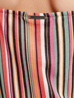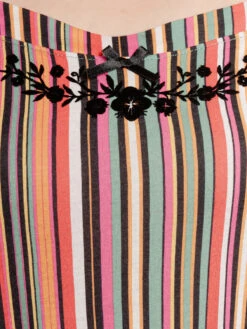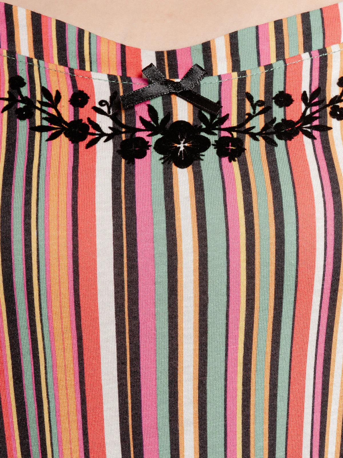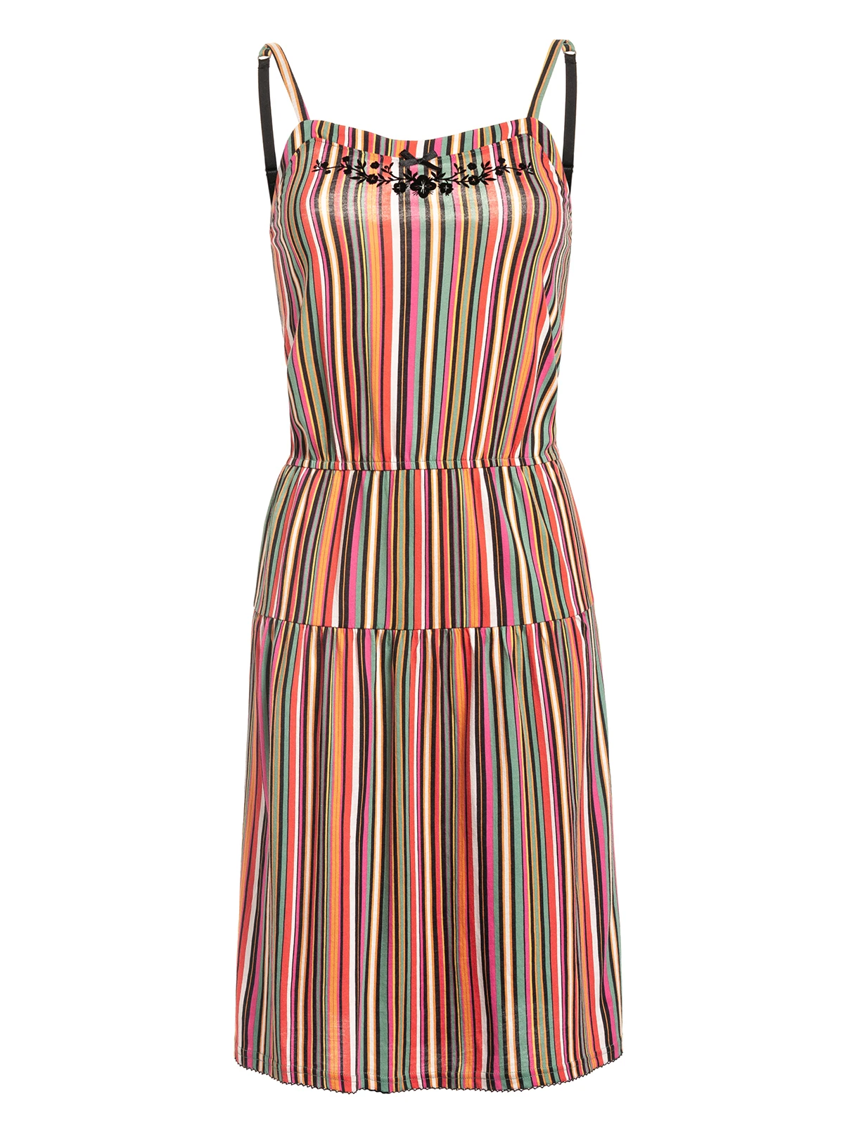 Das sĂĽĂźe Trägerkleid ist aus einem angenehmen Baumwollmaterial mit Modalanteil. Es ist gerade geschnitten mit einem Gummizug in Taillenhöhe. Die dĂĽnnen Träger sind verstellbar, der herzförmige Ausschnitt wird mit einer breiten Stoffblende abgeschlossen. Eine Blumenstickerei sowie eine schwarze Satinschleife bilden das Highlight am Deolletee. Der Gummizug sorgt fĂĽr einen guten Sitz und wird von einem BindegĂĽrtel kaschiert. Ein angesetzer Volant trennt den unteren Rockteil optisch. Der bunte Farbmix sorgt fĂĽr gute Laune, selbst wenn die Sonne nicht scheint. Das Kleid ist somit ein toller Alltagsbegleiter. Das ‚Viva Mexico Dress‘ ĂĽberzeugt mit liebevollen Details. Es kann super mit Wedges oder Espandrilles kombiniert werden. Ein Longcardigan dazu sieht in den Abendstunden besonders hĂĽbsch aus.