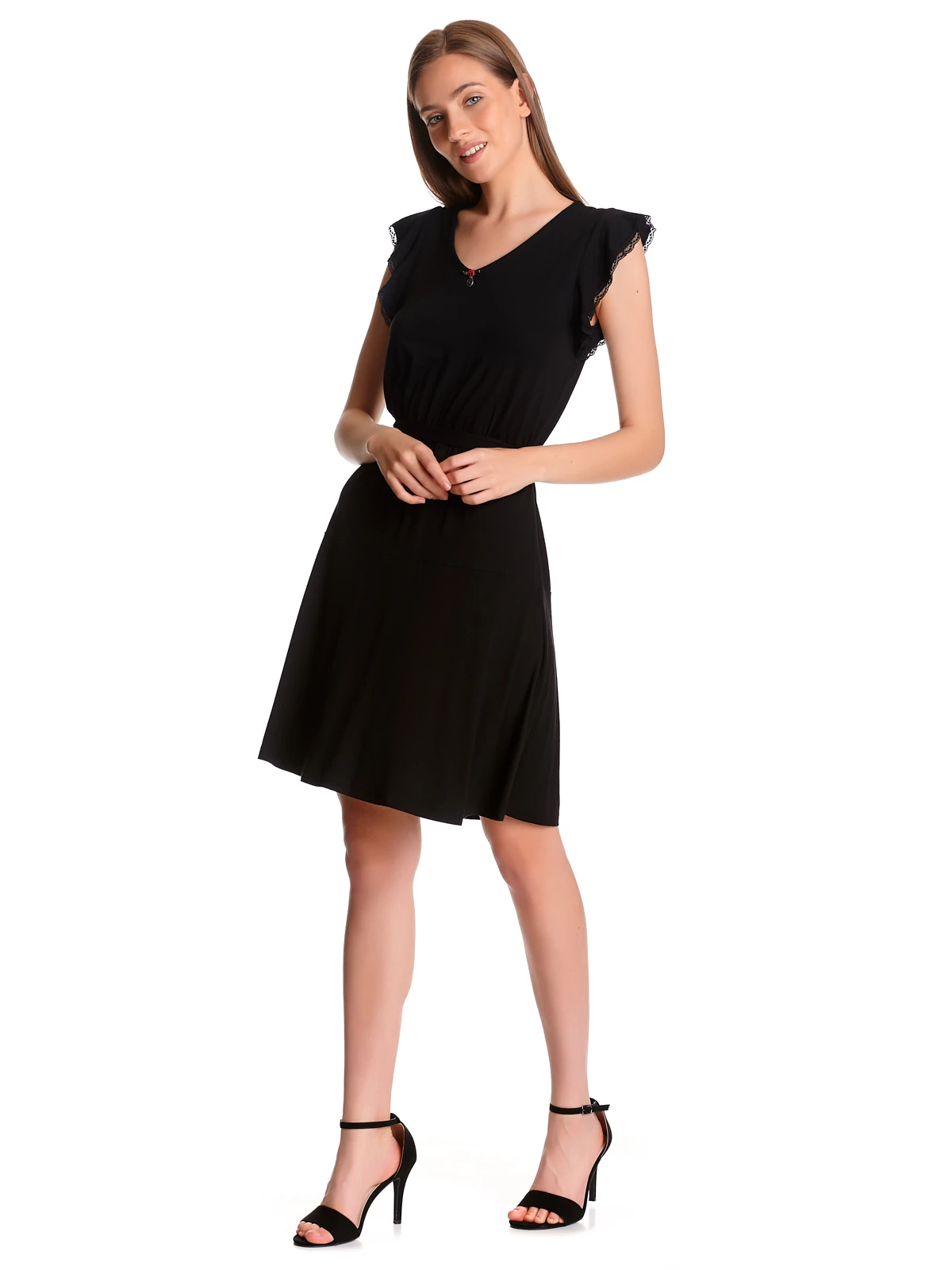 Black Dresses. Das Vive Maria Kleid ist aus einem angenehmen Viskosematerial mit Elasthananteil. Es ist in einer leichten A-Linie geschnitten und Ă„rmellos. Der Armausschnitt wird mit einem kleinen spitzenverzierten Volant abgeschlossen, sodass die Schulter davon bedeckt ist. Der V-Ausschnitt wird mit einer roten Satinrose und einem Metallanhänger verziert. Ein Gummizug in Taillenhöhe sorgt fĂĽr einen guten Sitz und wird von einem BindegĂĽrtel in Stofffarbe kaschiert. Ab einer Teilungsnaht in der mitte der Oberschenkel verläuft der Rockteil in sanfter A-Linie und fällt locker um die Beine. Ein tolles Kleid fĂĽr alle, die bequem und schick miteinander kombinieren möchten. Das ‚Vive Noir‘ Kleid ist ein sĂĽĂźer Alltagsbegleiter, dass sich aber auch beim abendlichen Restaurantbesuch sehen lassen kann. Kombiniert werden kann das kleine schwarze mit Pumps, Boots oder auch Sandaletten. Probiere es einfach aus.