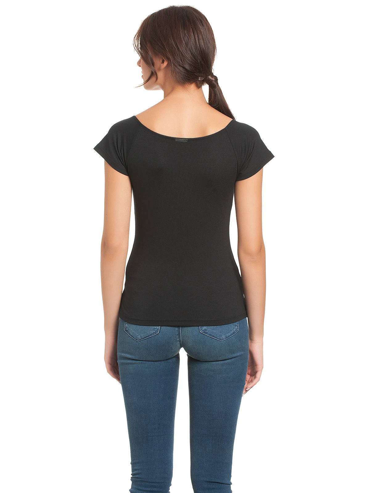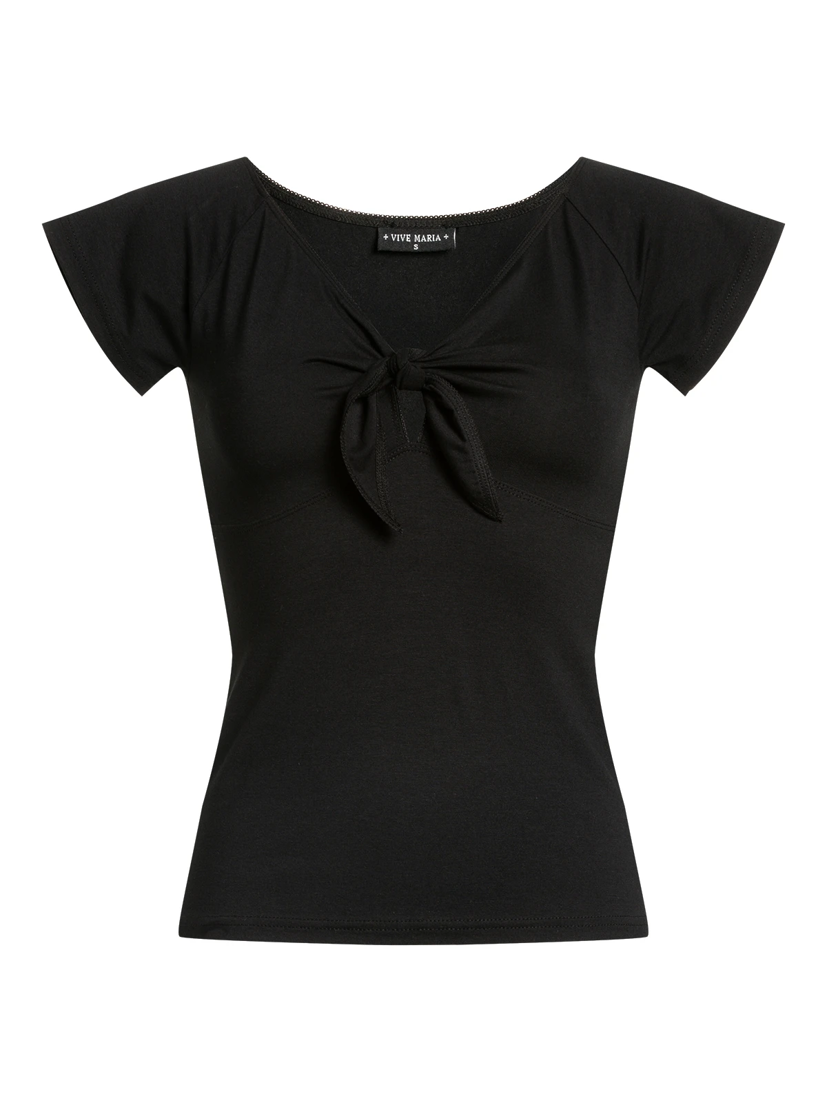 Das sĂĽĂźe Vive Maria Shirt ist aus einem angenehmen Viskosematerial mit Elasthananteil. Es ist figurbetont geschnitten und ĂĽberzeugt mit schlichter Eleganz. Das Shirt hat kurze Arme und einen tiefen V-Ausschnitt, der mit einer schwarzen Litze abgeschlossen wird. Der Ausschnitt wird vorne zusammengeknotet, sodass ein kleines Guckloch entsteht. Eine geschwungene Unterbrustnaht sorgt fĂĽr einen guten Sitz. Das Shirt ist unifarben schwarz. Das ‚Vive Noir‘ Shirt ist ein toller Alltagsbegleiter, der sowohl zur Jenas als auch zur Stoffhose passt. Wem das Shirt etwas zu dunkel ist, der findet im ‚My Capri Shirt‘ oder ‚Lovely Capri Shirt‘ eine tolle Alternative.