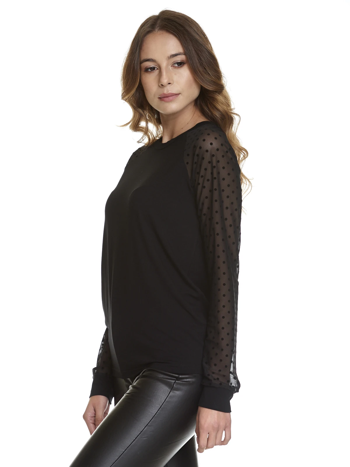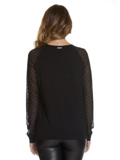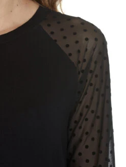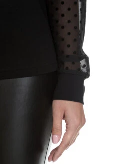 Verführerisches Schwarz trifft auf einen Hauch aus Tüll! Dieses coole Vive Maria Shirt besteht aus einem angenehmen Viskosematerial mit Elasthananteil. Der eingesetzte Tüll ist aus einem weichen Polyesterstoff mit Elasthan gemacht. Die langen Arme, bestehen aus einem schwarzen transparenten Pünktchentüll und enden in breiten Bündchen. Der runde Ausschnitt ist schwarz eingefasst. Der Torso des Shirts besteht aus einem weichen schwarzen Stoff. Elegant aber trotzdem sportlich. Ob zum Bleistiftrock oder zur Jeans, dieses Shirt ist ein Hingucker und lässt sich nach Belieben stylen!